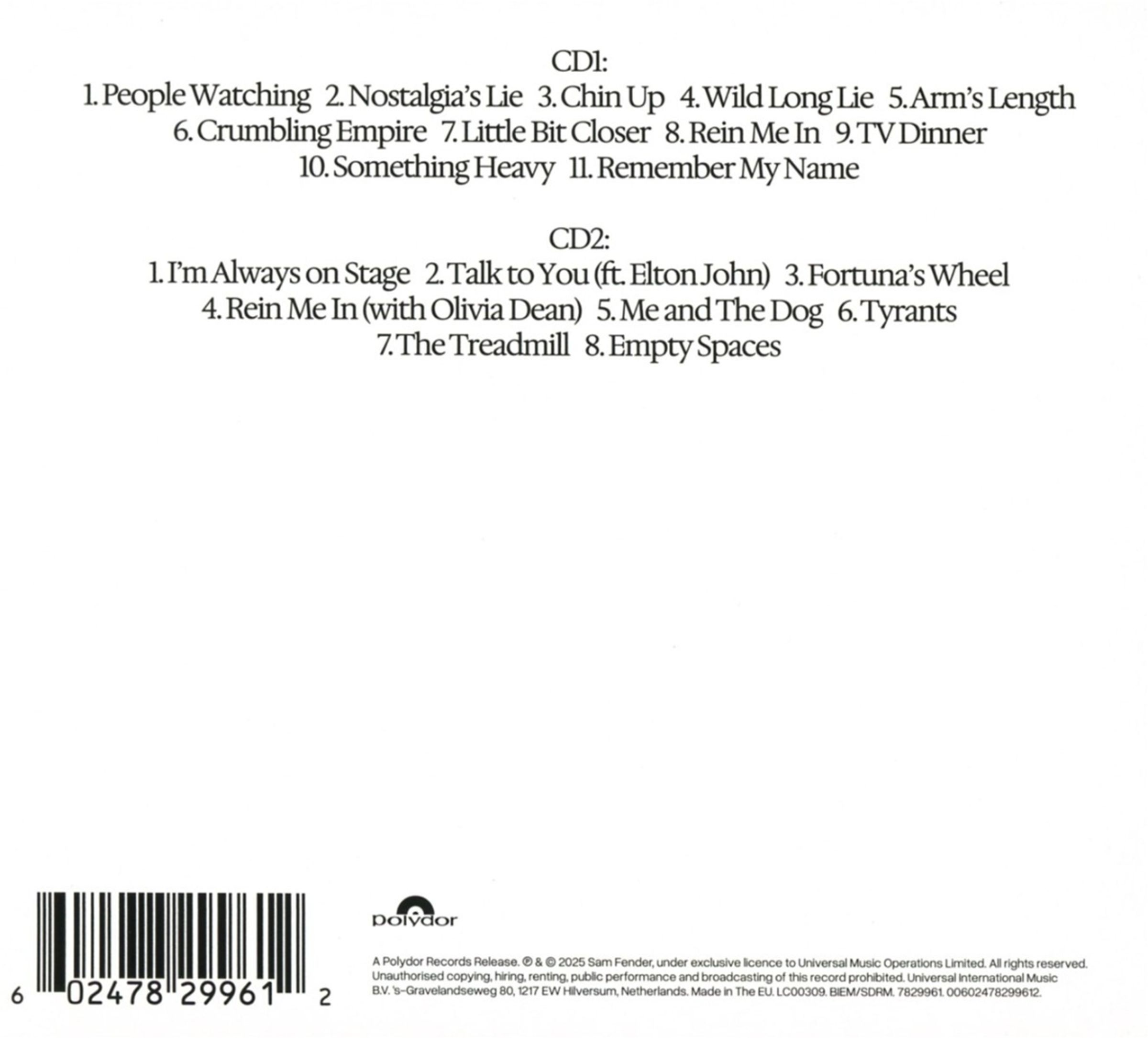 Nach einem erfolgreichen Jahr 2025, in dem Sam Fender Konzerte im London Stadium und dreimal im St James' Park in Newcastle ausverkaufte, neben einer Nominierung für den Mercury Music Prize und dem am schnellsten verkauften britischen Album des Jahres, erscheint 2025 »People Watching Deluxe«. Die Deluxe-Version enthält acht zusätzliche Songs, darunter »Rein Me In« (mit Olivia Dean) und die neue Single »Talk to You« (mit Elton John).
