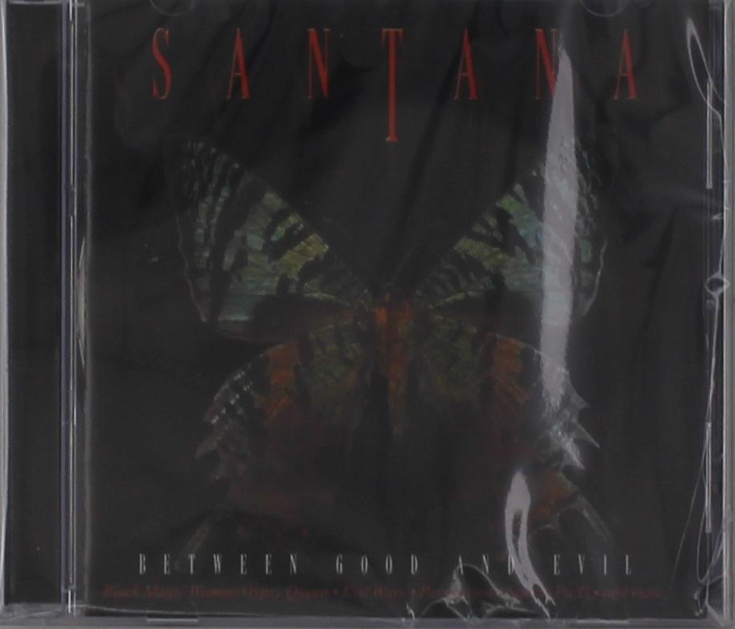 SANTANA oben in Rot, BETWEEN GOOD AND EVIL unten in Weiß. Ein Schmetterling auf dunklem Hintergrund., CD