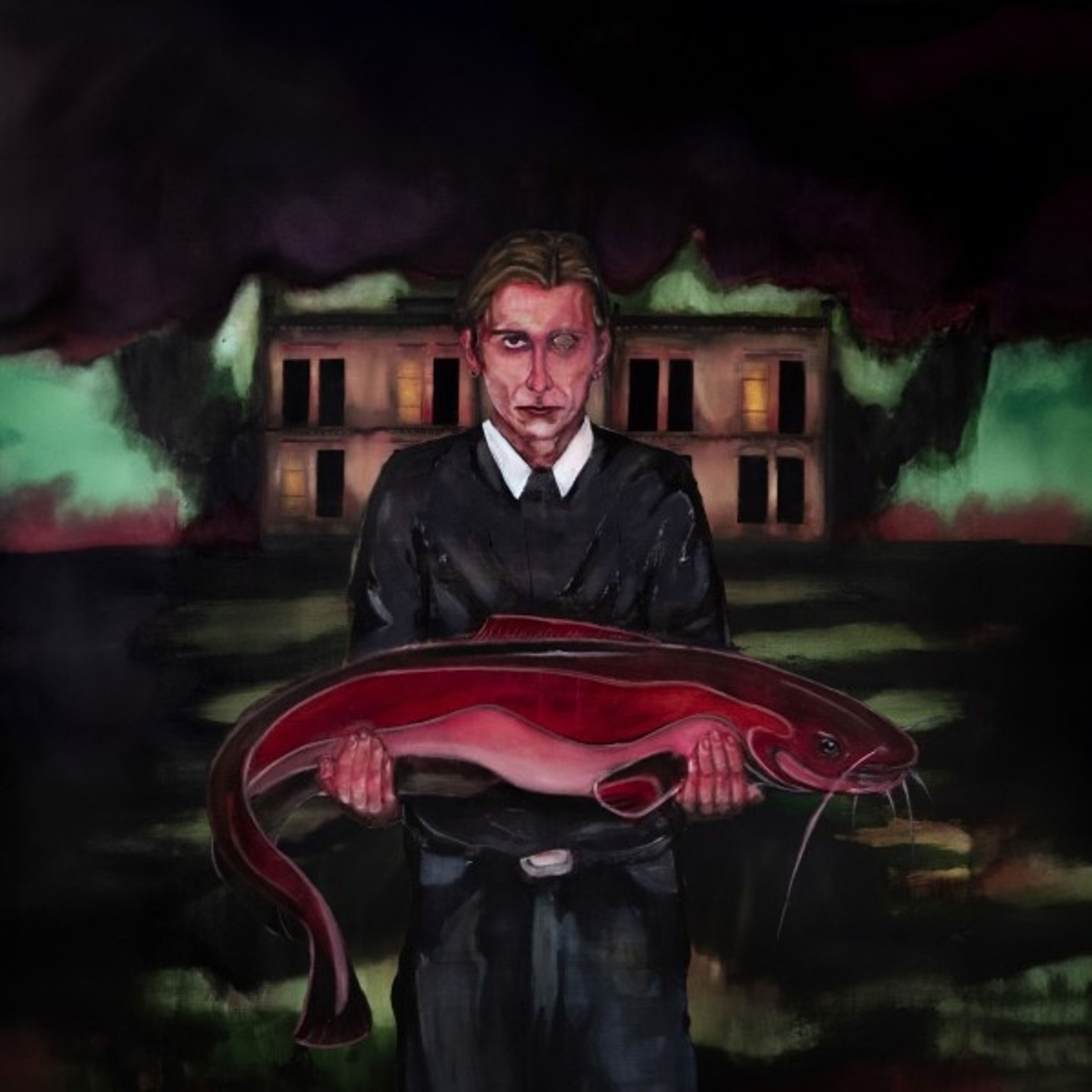 Ein Mann in dunkler Kleidung hält einen großen Fisch. Im Hintergrund ist ein düsteres Gebäude zu sehen, umgeben von dunklen Wolken., LP