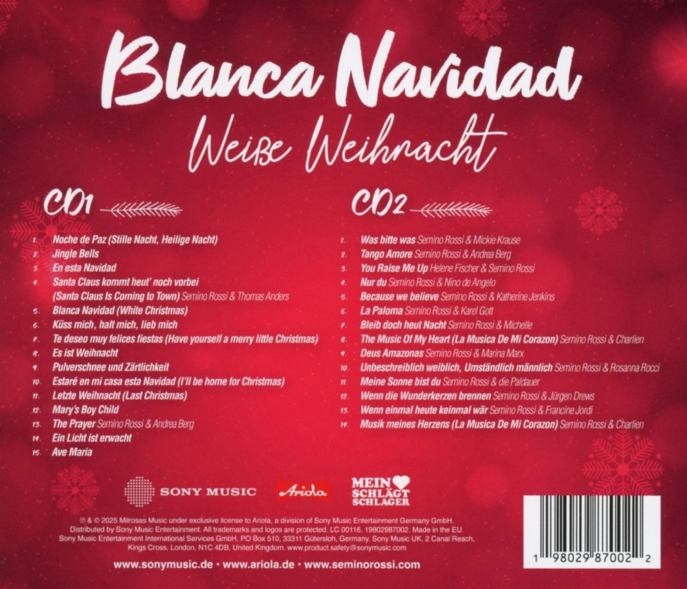 Sein 2025 erscheinendes Album »Blanca Navidad – Weiße Weihnacht« enthält 15 brandneue Weihnachtssongs, die in Zusammenarbeit mit dem renommierten City of Prague Philharmonic Orchestra entstanden sind. Die Kombination aus Semino Rossis gefühlvoller Stimme und orchestraler Klangfülle sorgt für ein emotionales und besinnliches Hörerlebnis. Als besonderes Extra veröffentlicht Semino Rossi auch eine exklusive Zusammenstellung seiner schönsten Duette – ein Rückblick auf die berührendsten musikalischen Begegnungen seiner Karriere. Diese Sammlung vereint große Momente mit namhaften Künstlern und zeigt die Vielseitigkeit und Tiefe seines musikalischen Schaffens.