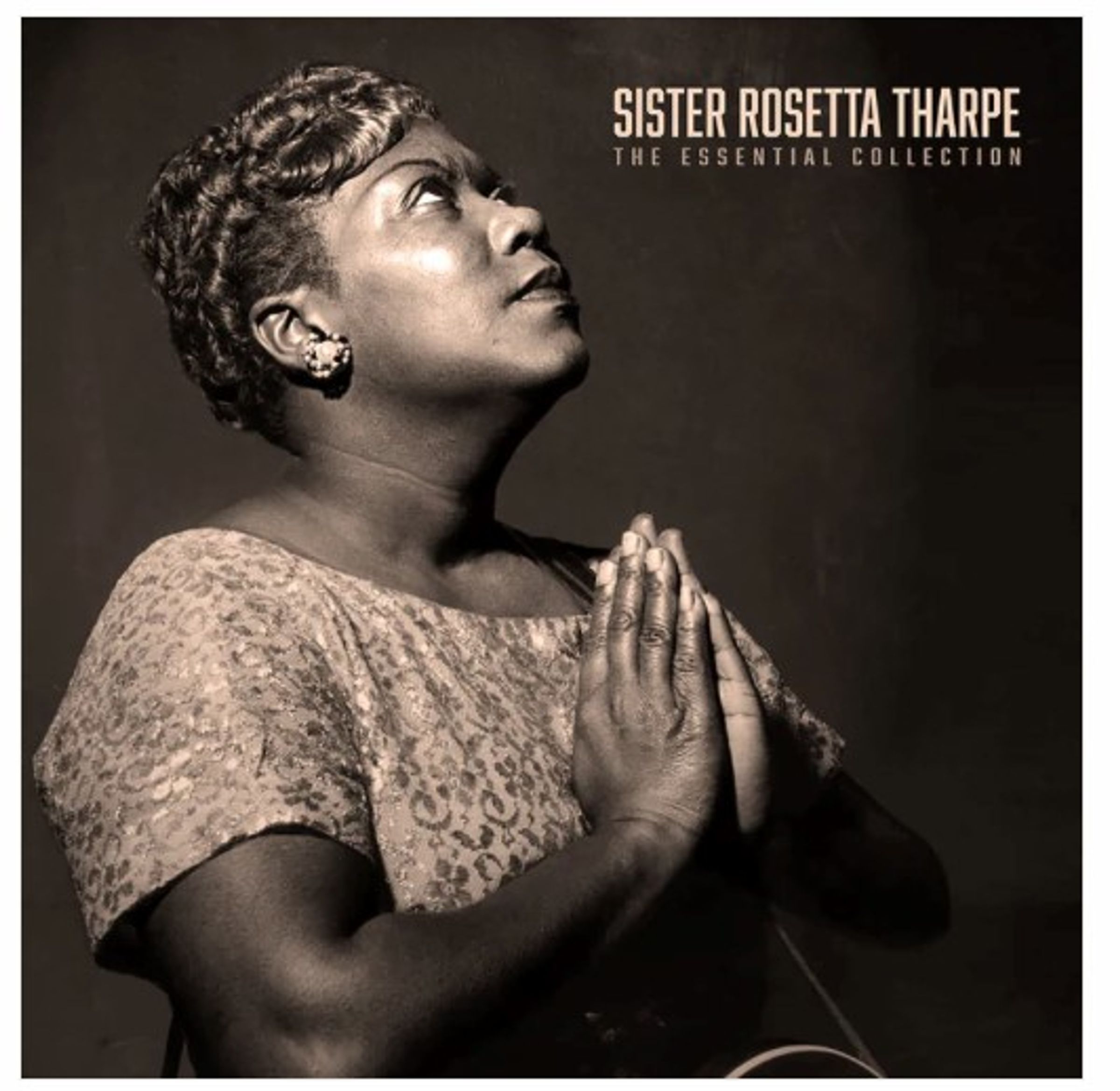 Oben steht „Sister Rosetta Tharpe: The Essential Collection.“ Eine Frau im Profil hält die Hände betend zusammen., LP