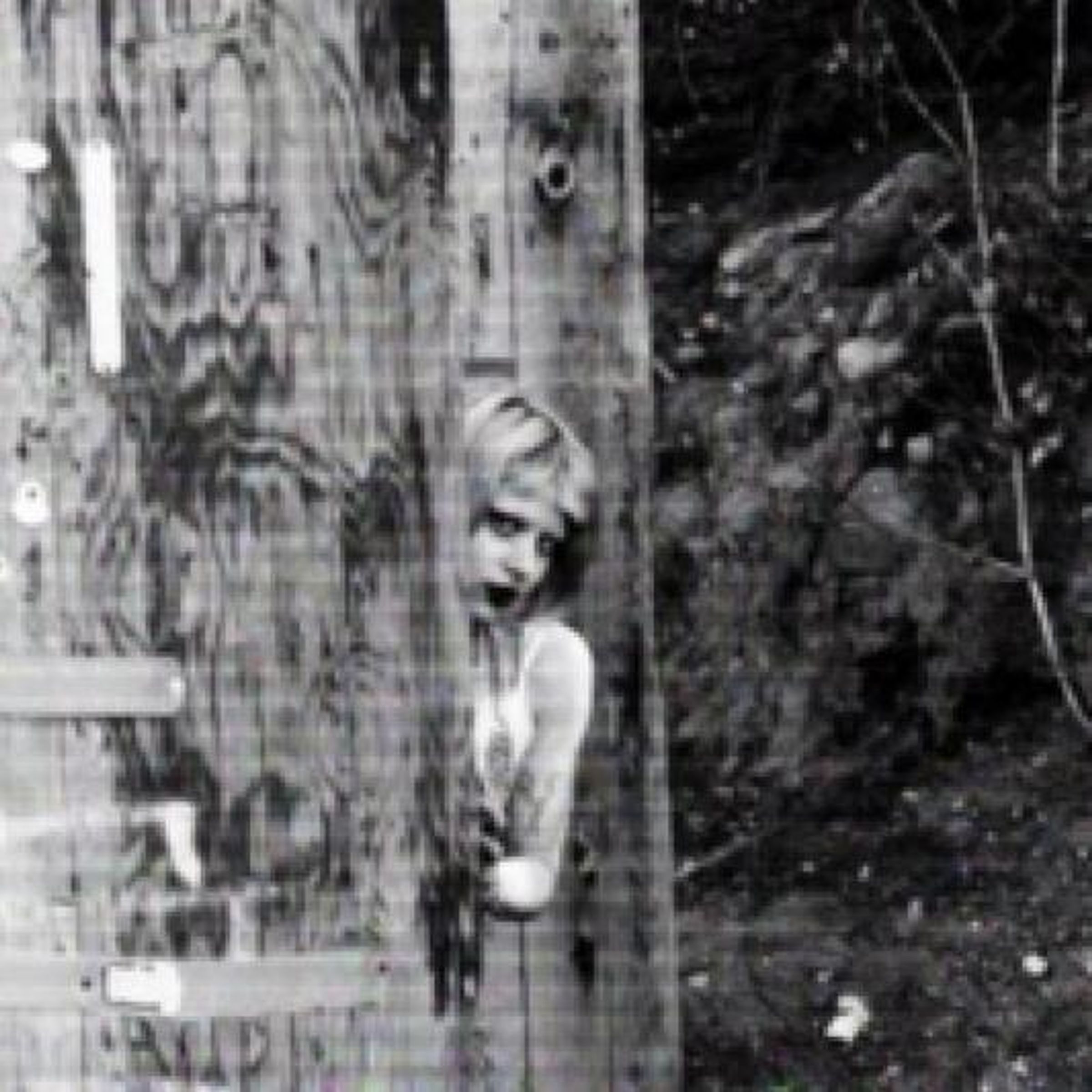 Ein schwarz-weißes Foto zeigt eine Person, die hinter einem großen Holzbalken hervorschaut, in einer Waldumgebung., LP
