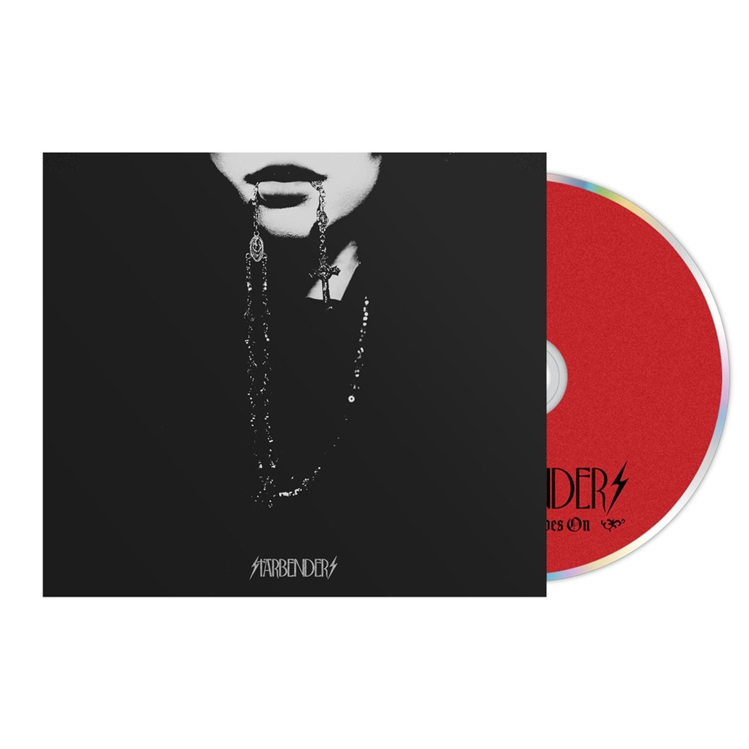 Text: "STARBENDERS". Eine Person hat Ketten im Gesicht, eine mit einem Kreuz, schwarz-weiß gehalten., CD