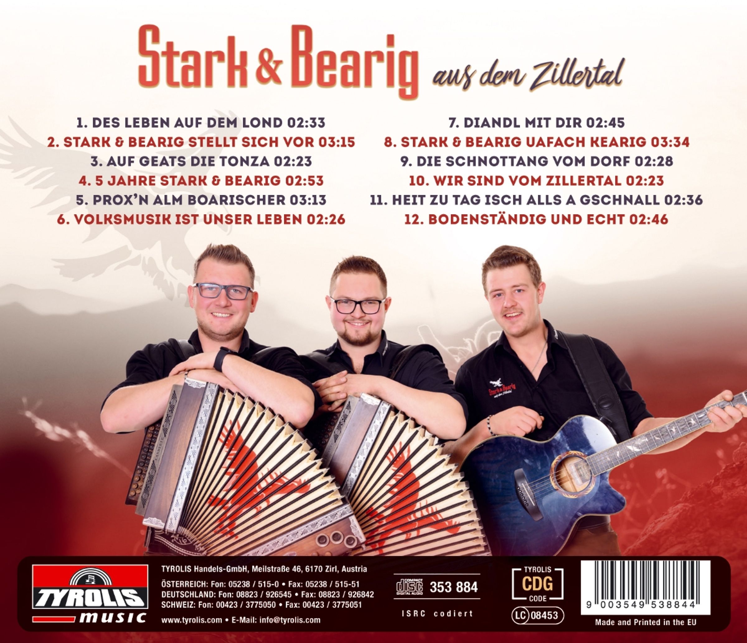 „Stark & Bearig aus dem Zillertal“ und „Uafach Kearig“. Drei Männer mit Instrumenten vor Bergkulisse., CD