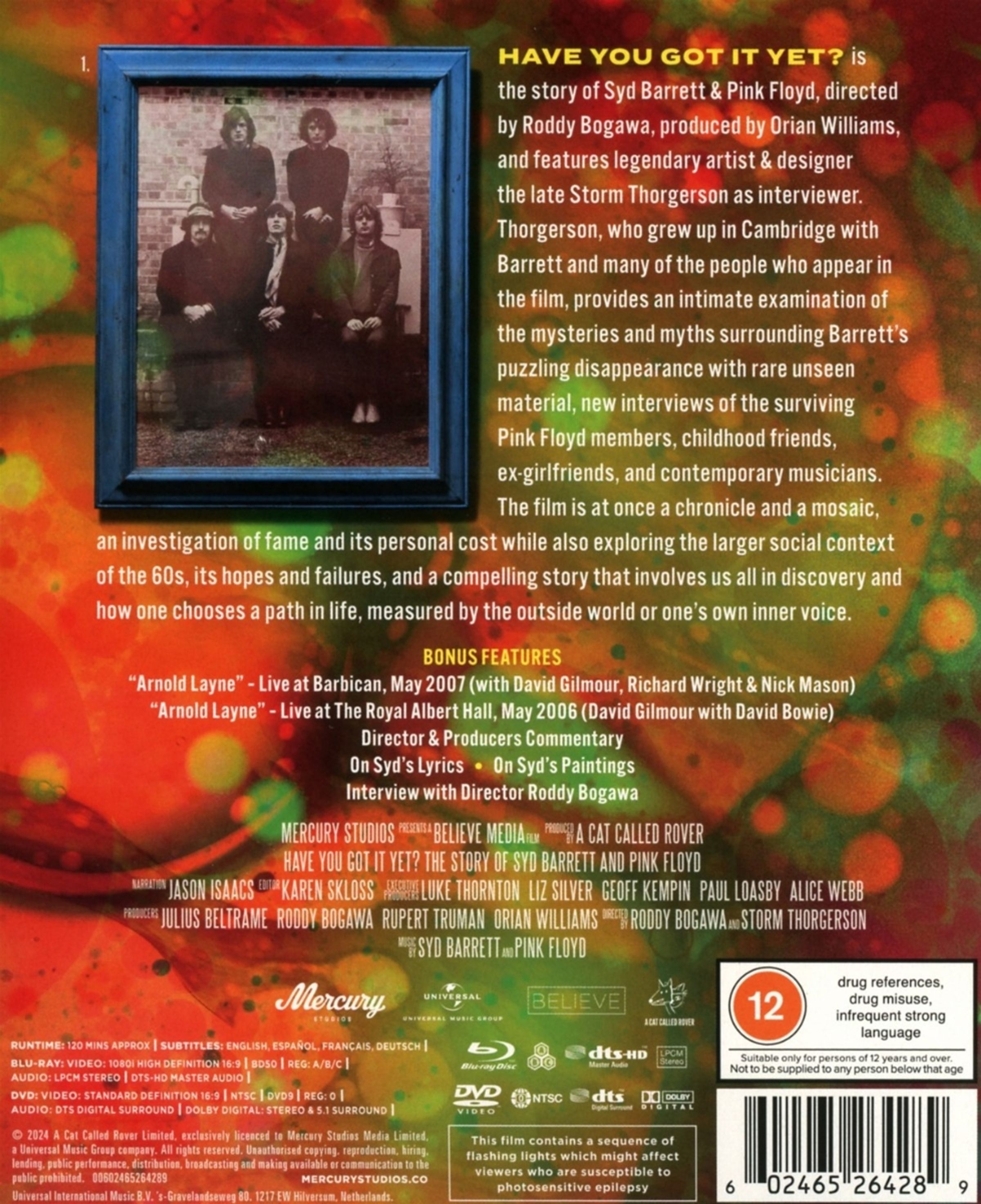 Dieses Paket enthält »Have You Got It Yet? The Story Of Syd Barrett And Pink Floyd« auf DVD und Blu-ray, zusammen mit einem exklusiven, von StormStudios gestalteten Poster. Die DVD und Blu-ray enthalten einen Kommentar des Regisseurs und der Produzenten des Films mit Roddy Bogawa, Julius Beltrame und Rupert Truman sowie 26 Minuten Bonusmaterial: