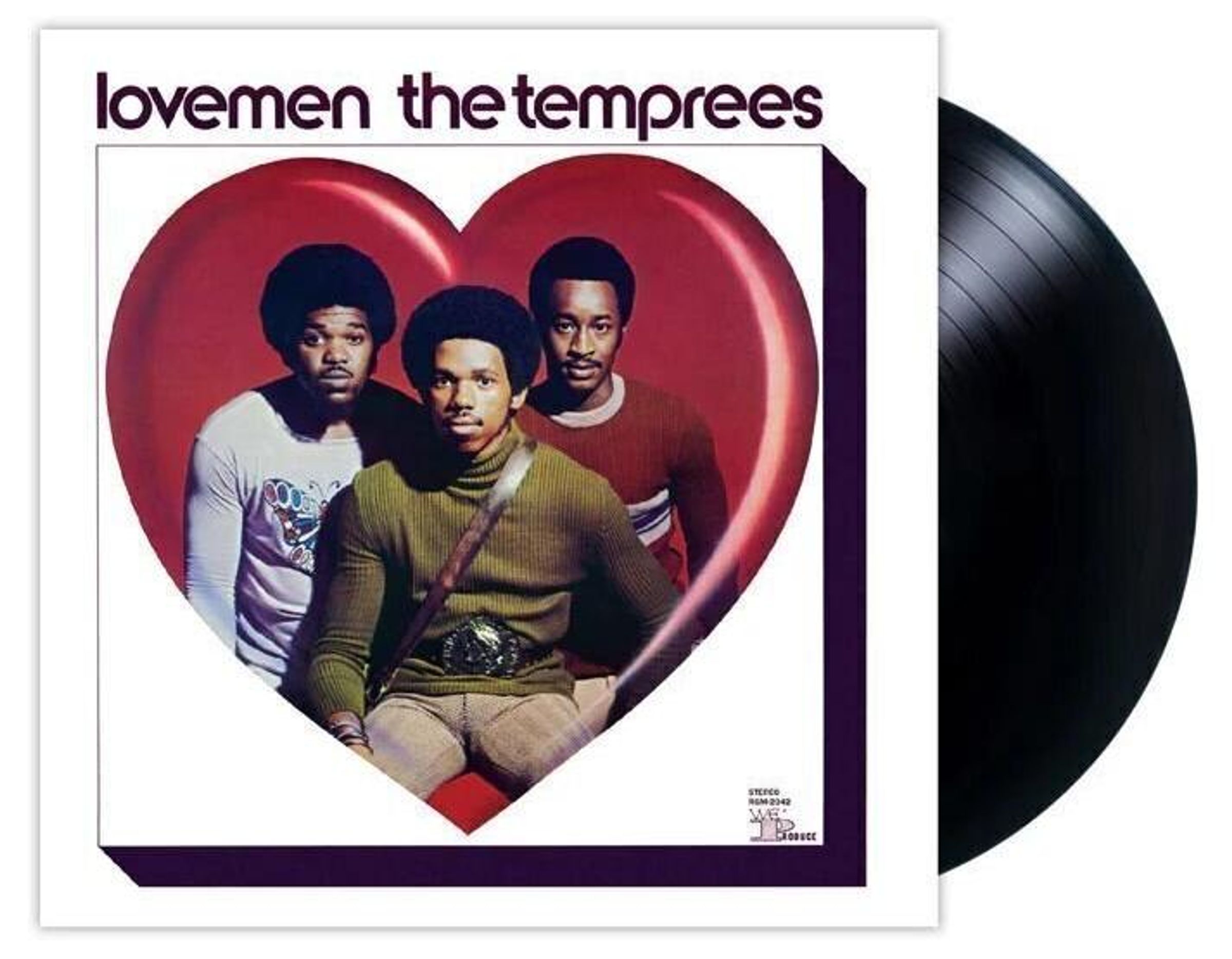 Text: "lovemen the temprees". Drei Männer in einem großen roten Herz. Eine Schallplatte rechts., LP