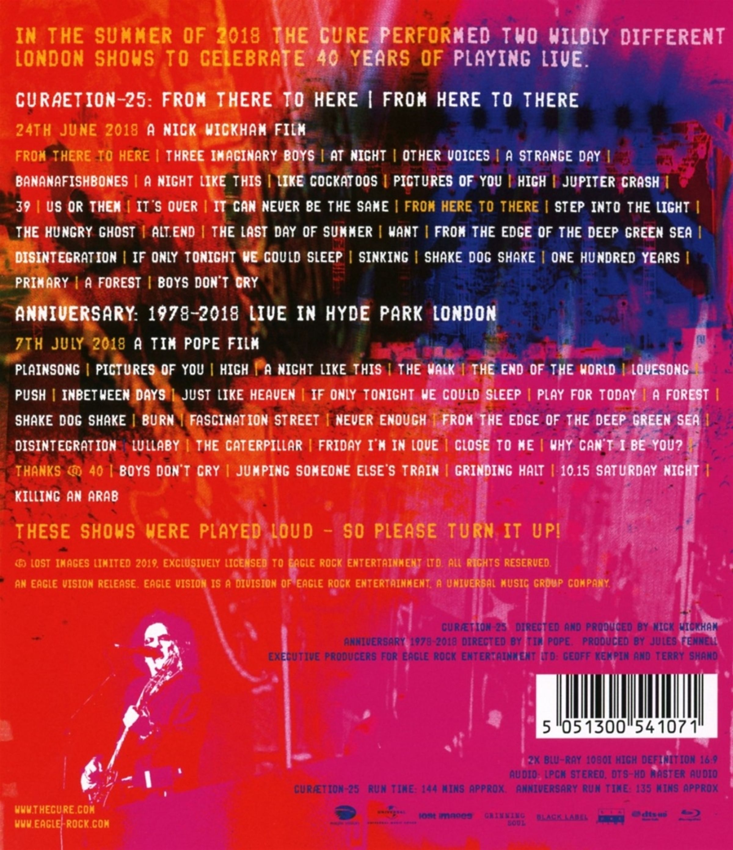 Im Juli 2018 luden The Cure schließlich zum Jubiläumskonzert im Londoner Hyde Park, wo sie von zehntausenden Fans insgesamt 29 Songs darboten. Unter der Regie von Tim Pope entstand der Konzertfilm »Anniversary 1978 - 2018: Live in Hyde Park London«.