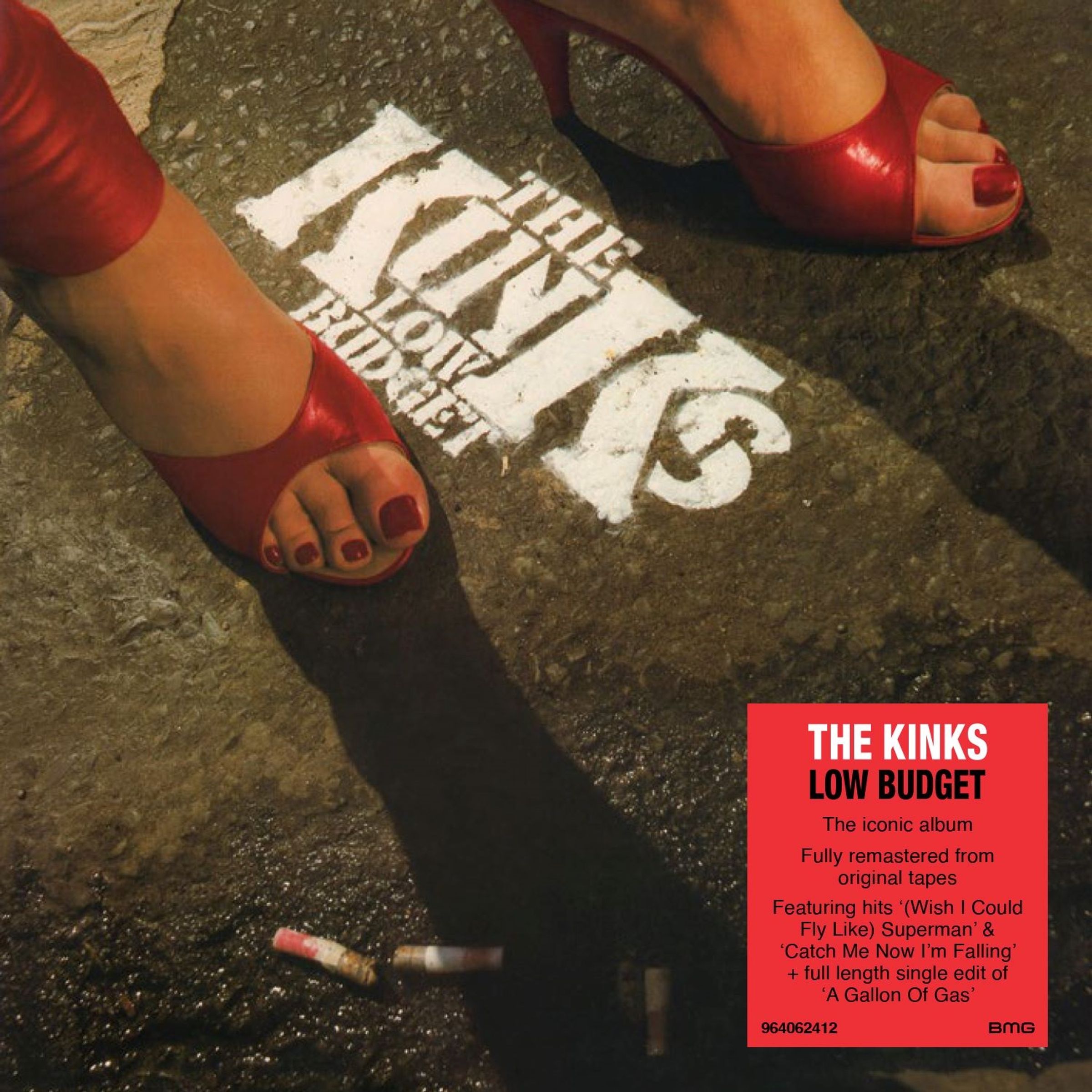 "The Kinks" und "Low Budget" in schwarzer Schrift auf roter CD. Straßenmotiv mit roten Schuhen und Straßenmarkierungen., CD