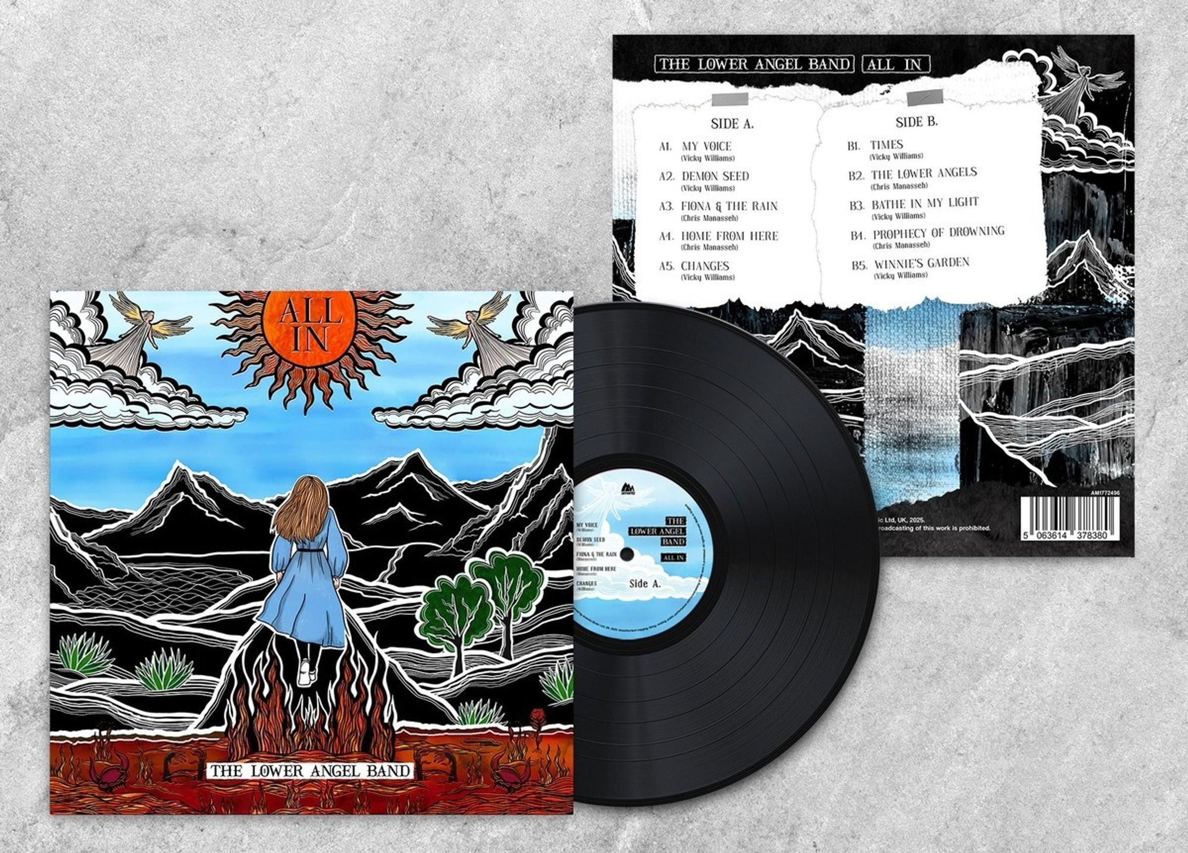 Text: "ALL IN", "THE LOWER ANGEL BAND". Ein Mädchen in blauem Kleid schaut in eine Berglandschaft mit Engel, Sonne und Wolken., LP