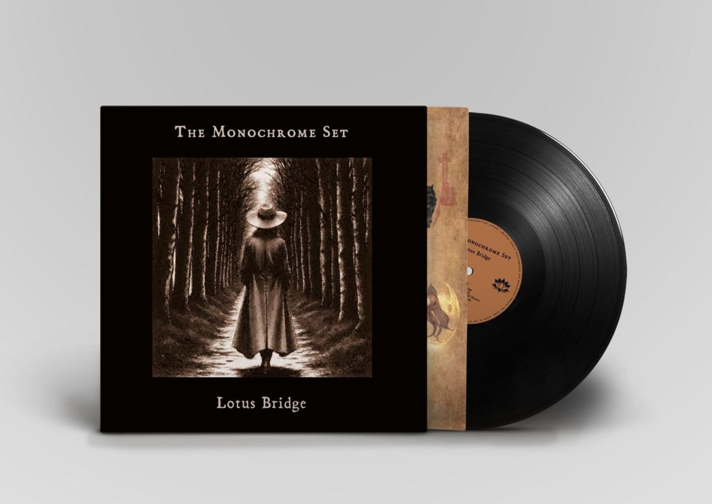"The Monochrome Set", "Lotus Bridge". Eine Illustration zeigt eine Person mit Hut auf einem Waldweg. Daneben eine Schallplatte., LP