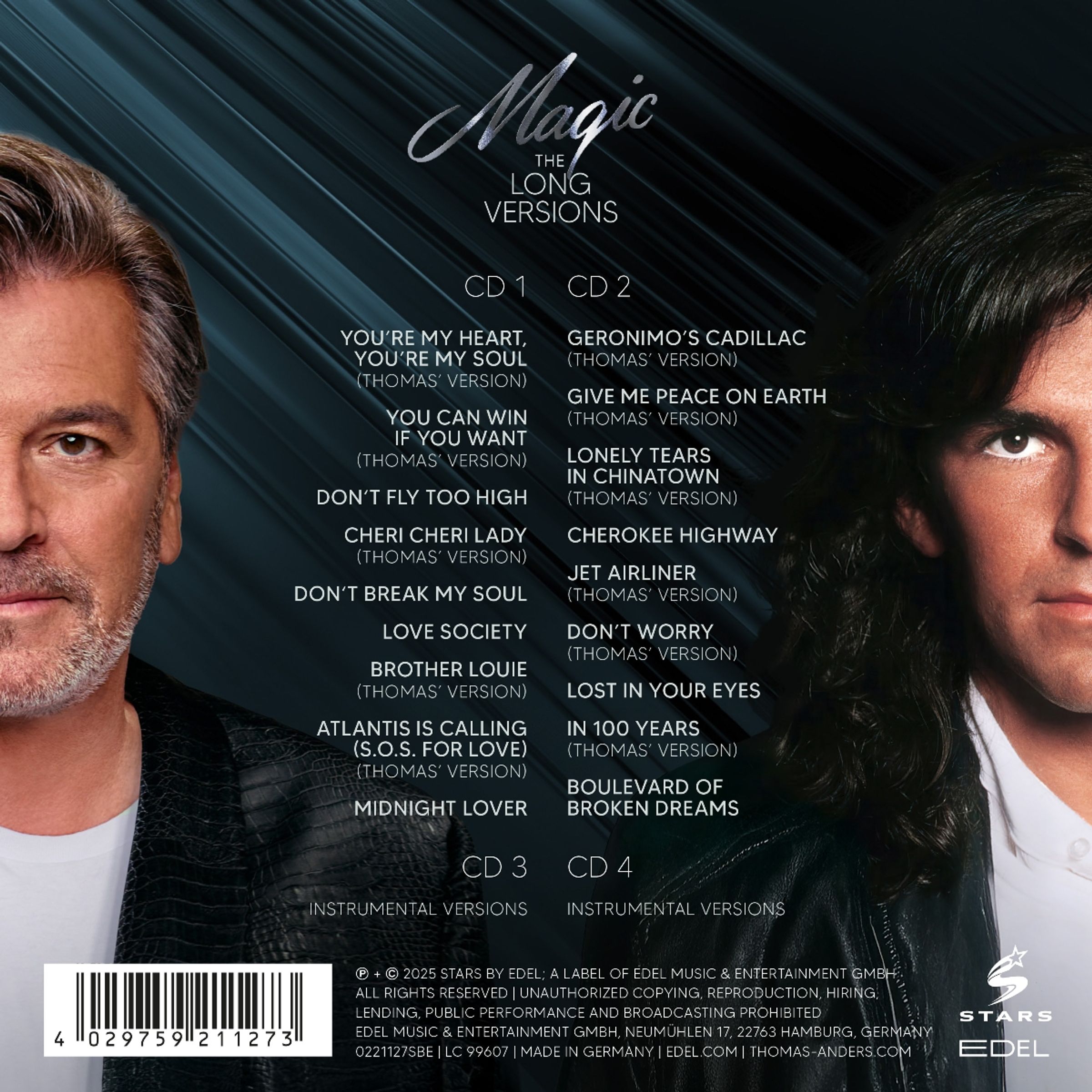 Mit „MAGIC – The Long Versions“ erscheint das fi nale Highlight des erfolgreichen Jubiläumsjahres von Thomas Anders. 18 einzigartige Long Versions aller Singles aus der gesamten Jubiläumskollektion – ein besonderes Geschenk für langjährige Fans, Sammler und alle, die den unverwechselbaren Sound von Thomas Anders lieben.