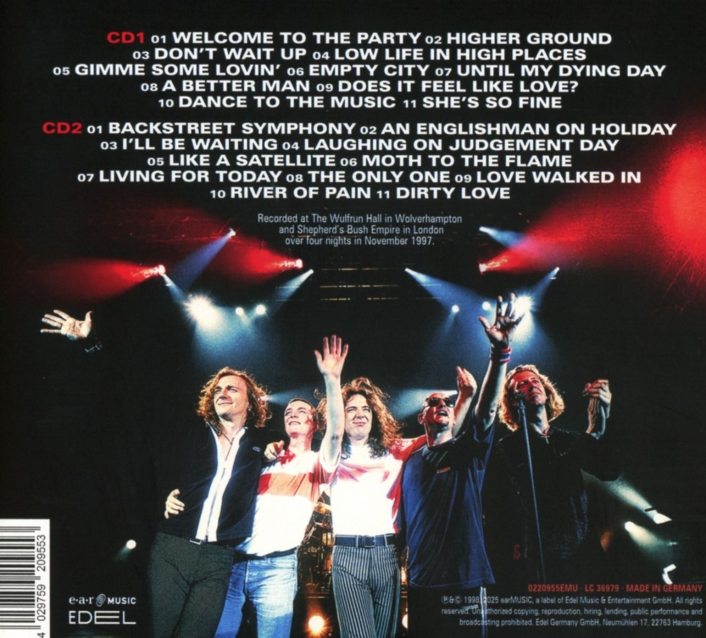 "THUNDER LIVE" in roter Schrift auf CD-Hülle; britische Flagge als Hintergrundmuster. Dynamisches Design., 2 CDs
