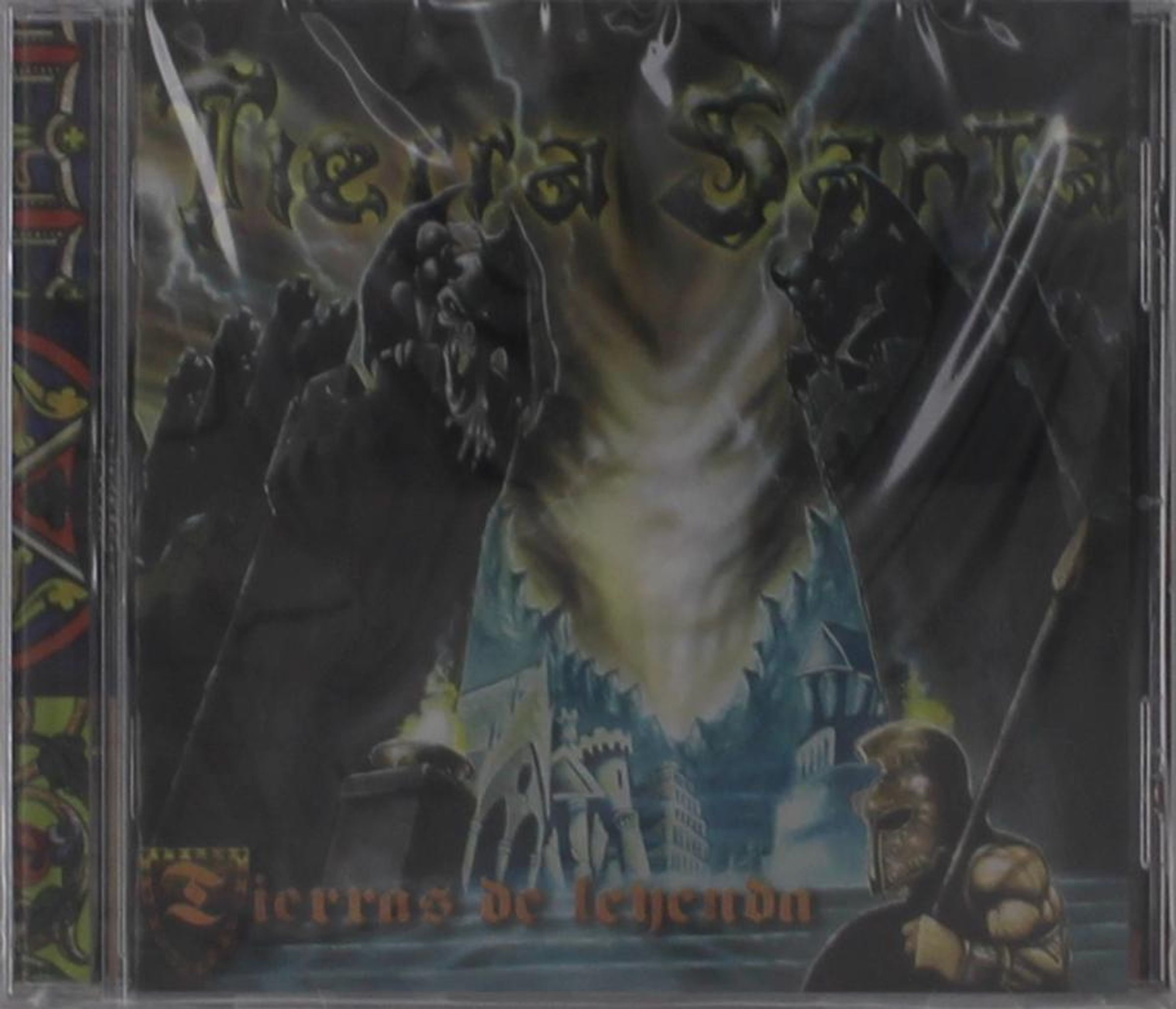 "Tierras de leyenda" in roter Schrift. Illustration: Burg, Krieger mit Helm und Schild, dramatische Himmelsszene., CD