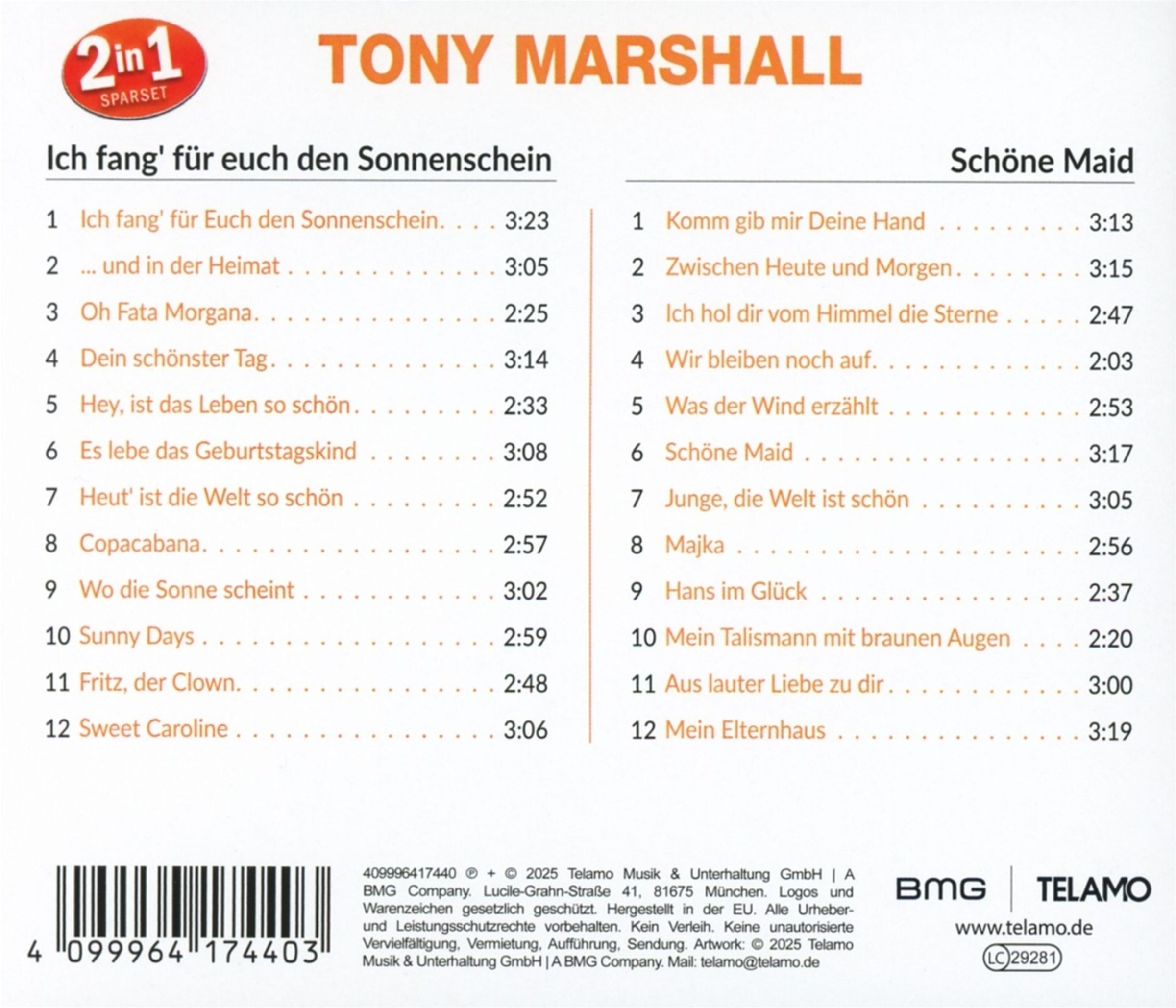 Tony Marshall: 2 in 1 Vol.3 (Ich fang für euch den Sonnenschein & Schöne Maid) auf 2 CDs