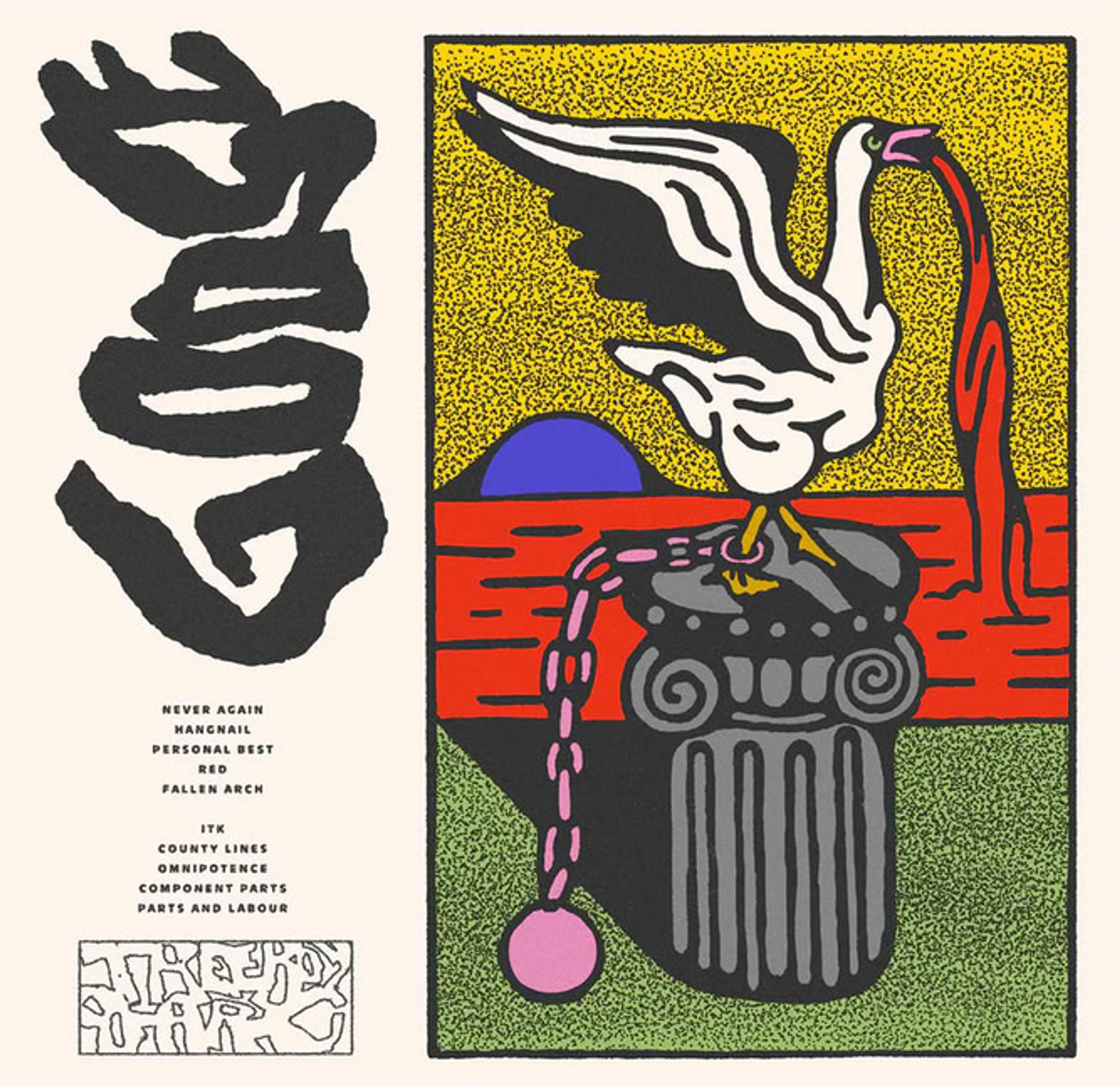 Cover mit großen, schwarzen Schriftzeichen links. Bunte Illustration: ein Vogel auf einer Säule, Hintergrund gelb. Goldene Schallplatte., LP