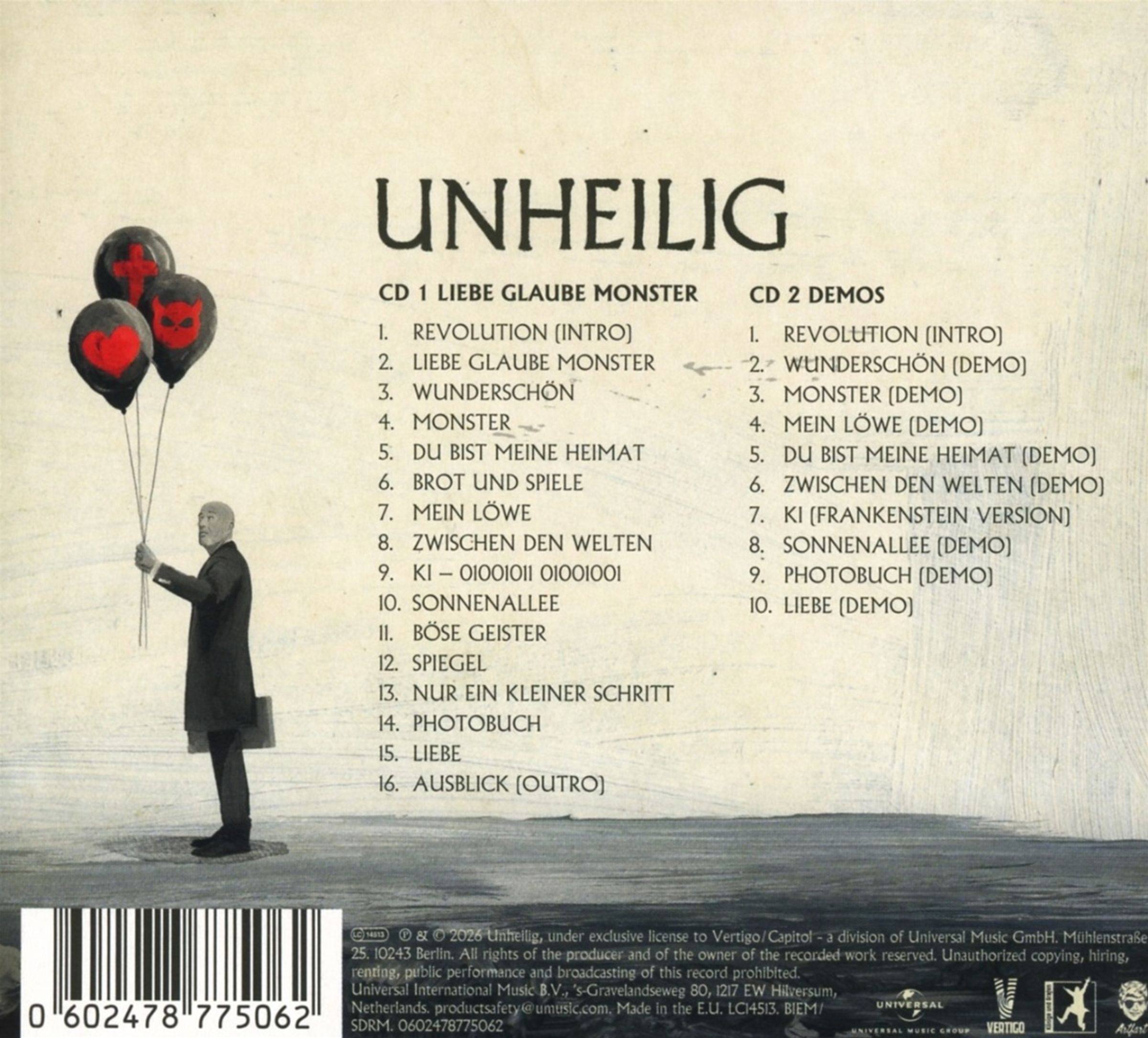 Mit dem 2026 erscheinenden Album »Liebe Glaube Monster« knüpfen Unheilig dort an, wo sie 2016 aufgehört haben. Die insgesamt 16 neuen Songs des Konzeptalbums widerspiegeln die Gedanken, Erlebnisse und Emotionen des Grafen, die er in den ausnahmslos von ihm selbst geschriebenen Texten verarbeitet. Die Schlagworte des Albumtitels ziehen sich als Leitmotive durch das berührende Gesamtwerk und spannen die Bögen zwischen den verschiedenen Dimensionen, die Unheilig auszeichnen. Auf dem Album geht es um Liebe, Freundschaft, Hoffnung, Zuversicht und auch um die Monster, denen wir uns alle im Leben stellen müssen.
