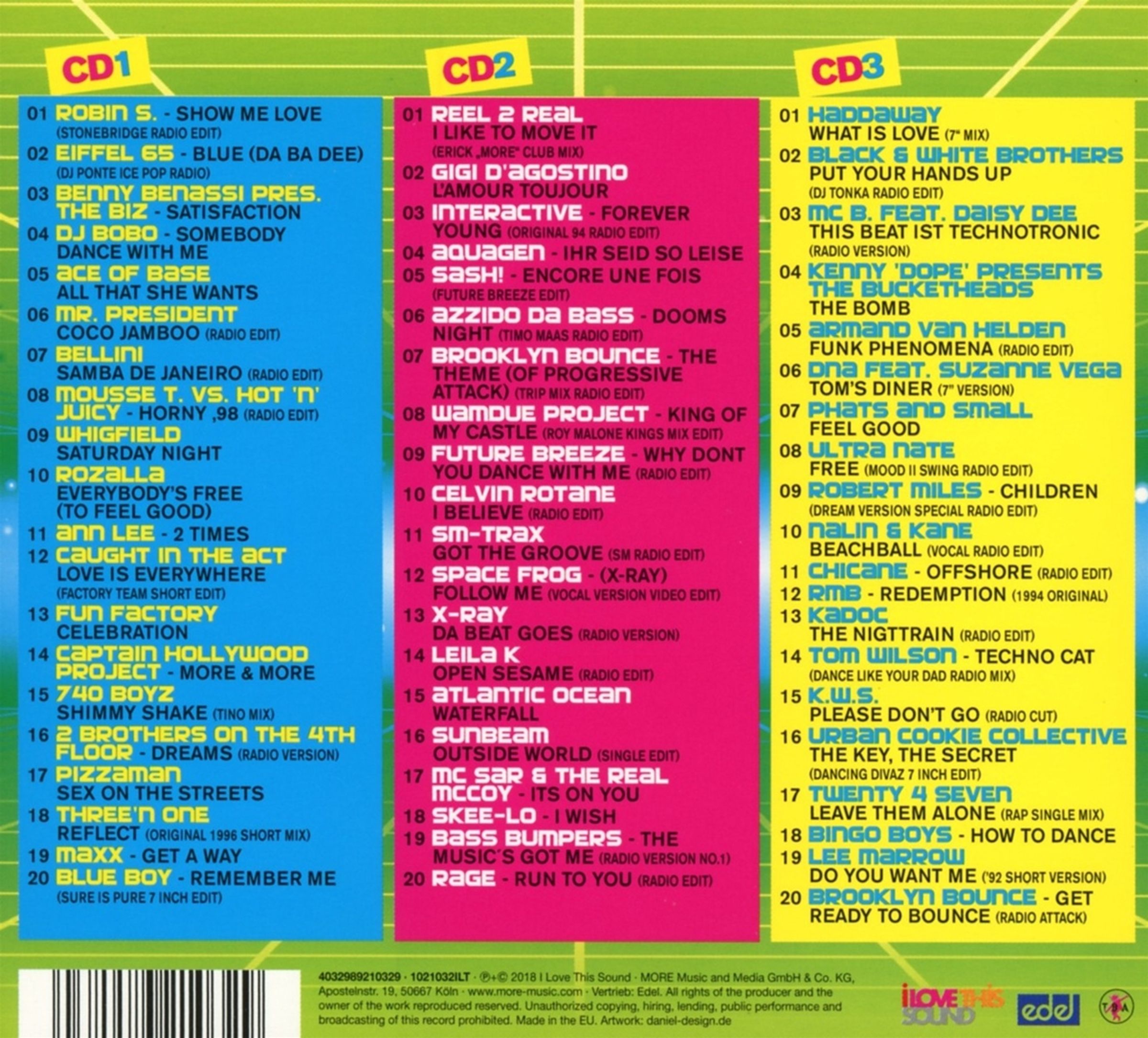 3 CDs mit den großen Anthems dieser Ära (u. a. mit Snap!, Mr. President, Robin S., Gigi D‘Agostino, Brooklyn Bounce u. v.m.) .