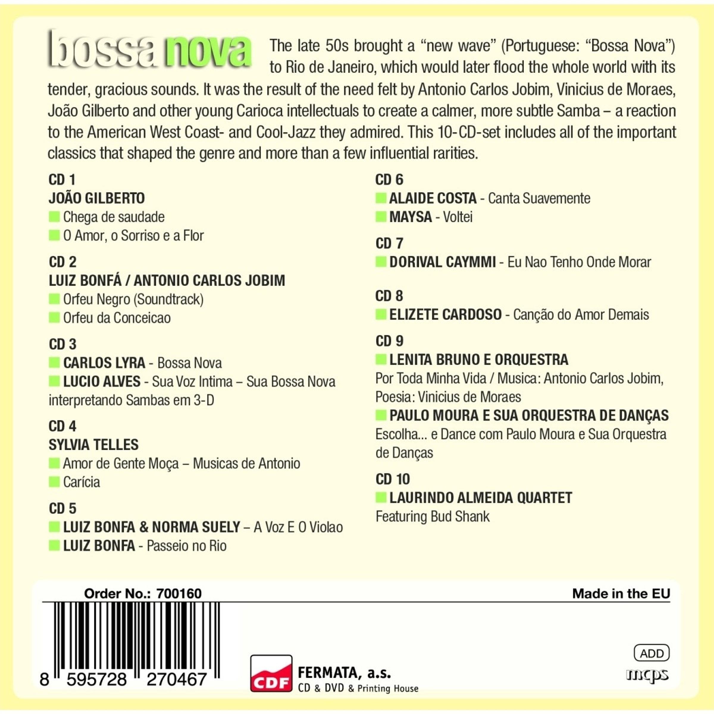 Diese 10CD-Sammlung enthält alle wichtigen Klassiker, die das Genre geformt haben - etwa den Soundtrack zu „Orfeu Negro“ - und dazu etliche einflussreiche Raritäten. Sie beginnt mit den ersten beiden Alben des singenden Gitarristen João Gilberto, bietet neben dem schon erwähnten Soundtrack zu „Orfeu Negro“ auch die Musik zum Theaterstück auf der Marcel Camus’ Spielfilm basiert, und dazu Klassiker und Raritäten von und mit Antonio Carlos Jobim, Luiz Bonfá, Sylvia Telles, Maysa, Elizete Cardoso, Laurindo Almeida, João Donato und vielen mehr. Es ist die Musik, die nach dem Rock’n’Roll und kurz vor der Beat-Welle so trendy war, dass selbst in einem deutschen Schlager nach ihr getanzt wurde (eben „Schuld war nur der Bossa Nova“). Dass sie zeitloser und nach wie vor moderner ist, zeigen die vielen Veröffentlichungen mit Pop- und Rock-Hits in Bossa-Nova-Versionen.