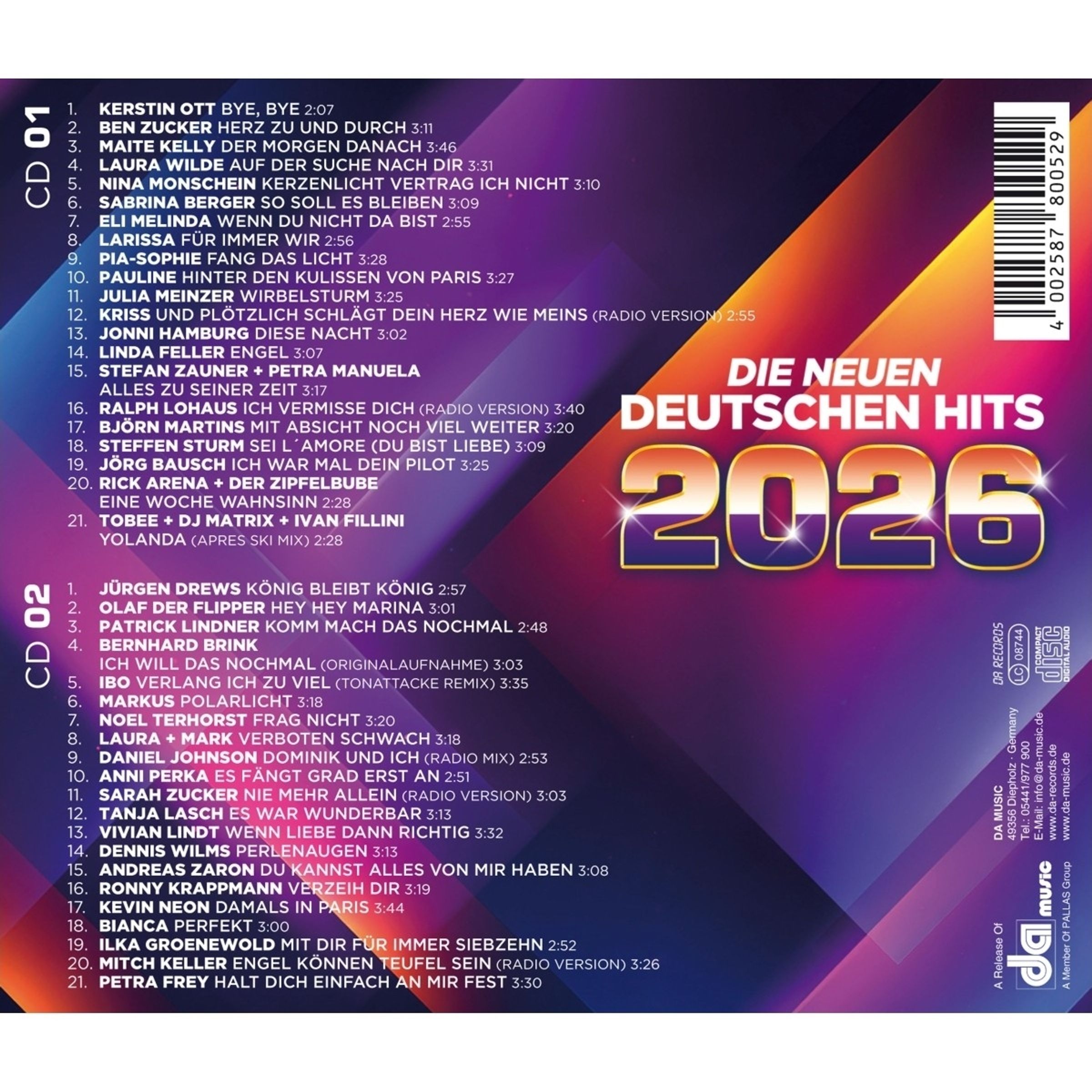 DIE NEUEN DEUTSCHEN HITS 2026. Darunter Fotos und Namen mehrerer bekannter Künstler in einem bunten Design., 2 CDs