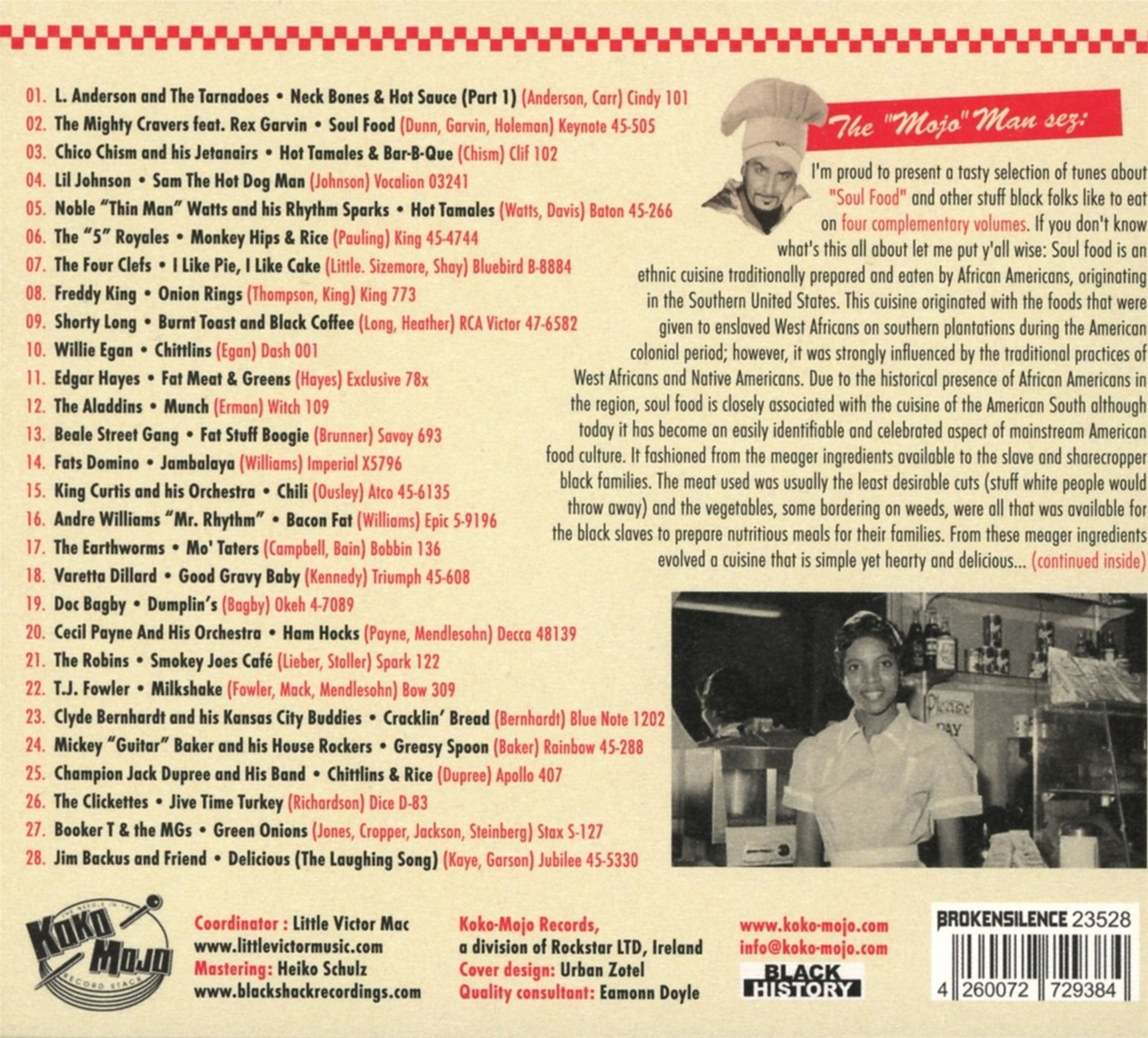 Natürlich haben afroamerikanische Musiker seit jeher ihr »Soul Food« besungen - so wie hier BOOKER T & THE MGS, THE ALADDINS, FATS DOMINO, CHAMPION JACK DUPREE, SHORTY LONG, THE MIGHTY CRAVERS, VARETTA DILLARD, KING CURTIS, FREDDY KING und viele Andere. LITTLE VICTOR MAC stellte nicht nur die Songs zusammen, sondern bietet mit den Linernotes interessante Fakten zum Thema.