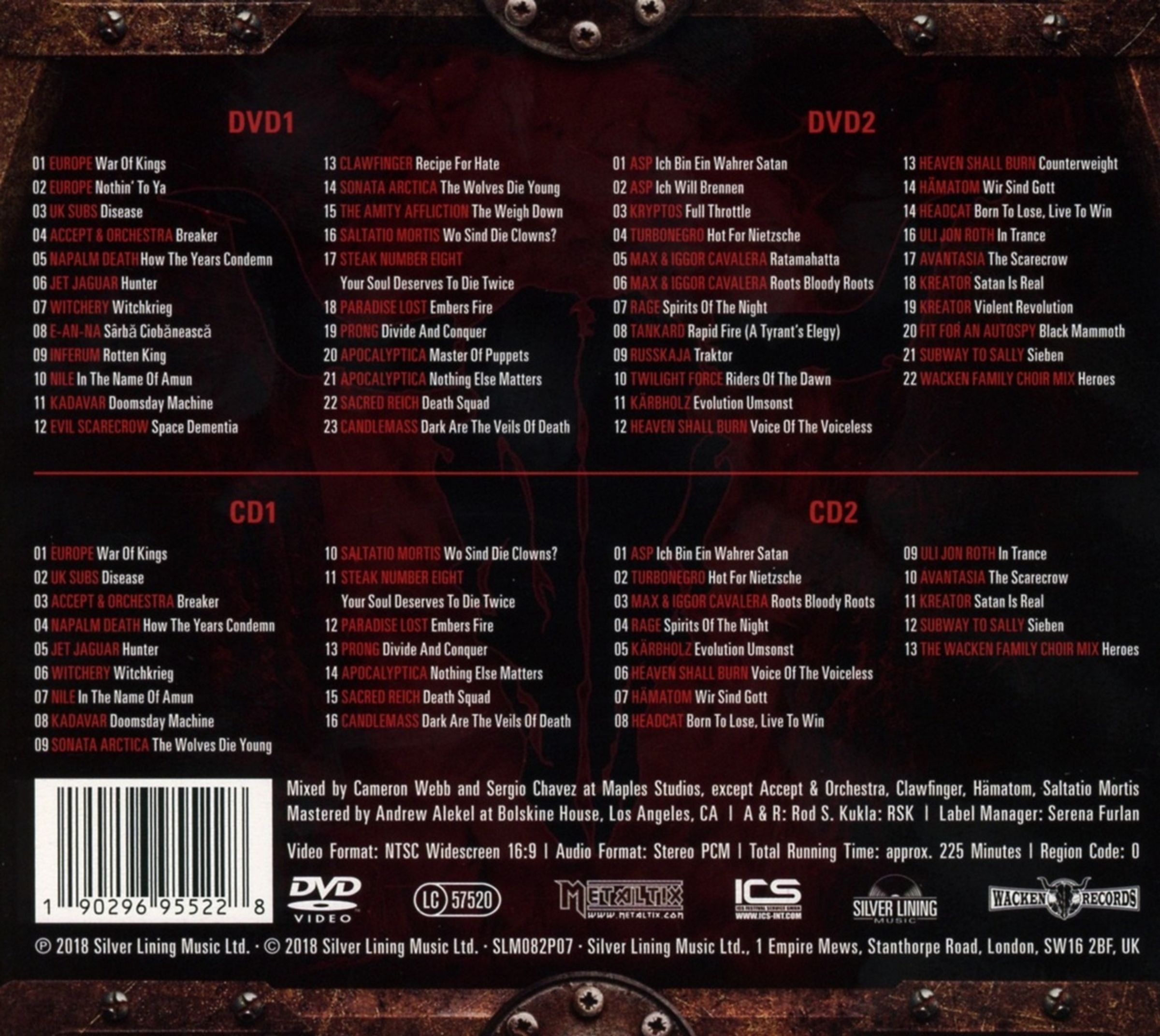 »Auf zwei DVDs bzw. zwei CDs gibt es die Auftritte von so unterschiedlichen Acts wie Europe, Accept, Subway To Sally, Napalm Death, Apocalyptica, Uli Jon Roth, Kadavar, Paradise Lost, Candlemass oder Turbonegro zu sehen und zu hören, Höhepunkt natürlich der ›Wacken Family Choir‹, der mit den Stimmen der 60.000 Festivalbesucher mit ›Heroes‹ einen bewegenden Tribut an den im Dezember 2015 verstorbenen und schmerzhaft vermissten Lemmy Kilmister liefert.« (Good Times, August/September 2018)Tracklisting