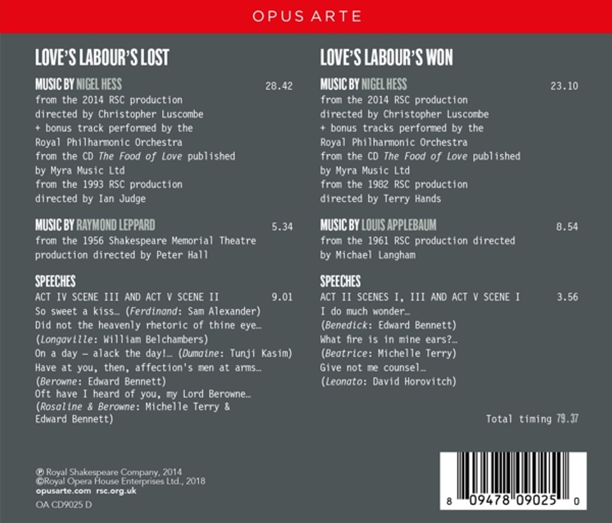Musik und Reden aus den Produktionen der Royal Shakespeare Company von 2014 unter der Regie von Christopher Luscombe. Musik von Nigel Hess. Außerdem mit Musik von Raymond Leppard aus der Produktion von Verlorene Liebesmüh des Shakespeare Memorial Theatre von 1956 und Musik von Louis Applebaum aus der Produktion von Verlorene Liebesmüh der Royal Shakespeare Company von 1961.