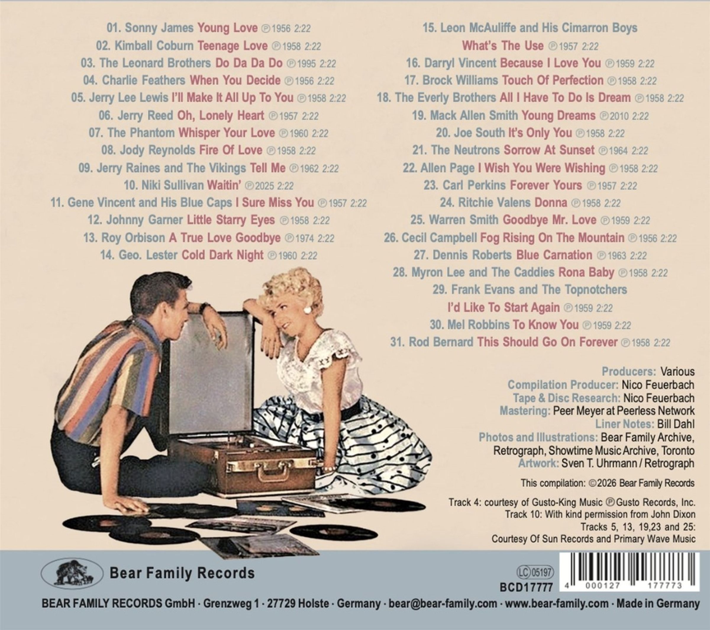 Gene Vincent and His Blue Caps’ unsterbliche Schnulze »I Sure Miss You« ist so herzzerreißend, dass sie sofort auf die Tränendrüsen drückt, und Carl Perkins holt jedes Quäntchen Pathos aus Forever Yours heraus. Rod Bernards »This Should Go On Forever«, ein Hit aus dem Jahr 1959, war einer der Eckpfeiler der Swamp-Pop-Bewegung im Süden Louisianas, während die Everly Brothers mit ihrem unvergesslichen Hit »All I Have To Do Is Dream« aus dem Jahr 1958 ihren einzigartigen Harmoniegesang auf ein ganz neues Niveau hoben und Ritchie Valens sich auf eine Weise nach seiner geliebten Donna sehnte, wie es nur ein Teenager verstehen kann, was Ritchie Ende 1958 für kurze Zeit zum Star machte.