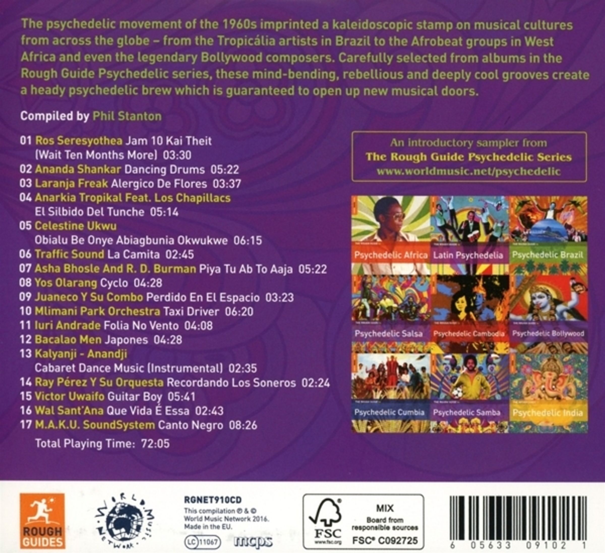 Die psychedelische Bewegung der 1960er Jahre prägte Musikkulturen auf der ganzen Welt einen kaleidoskopischen Stempel auf - von den Tropicvɬ°lia-Künstlern in Brasilien über die Afrobeat-Gruppen in Westafrika bis hin zu den legendären Bollywood-Komponisten. Sorgfältig aus den Alben der Rough Guide Psychedelic-Reihe ausgewählt, kreieren diese umwerfenden, rebellischen und zutiefst coolen Grooves ein berauschendes psychedelisches Gebräu, das garantiert neue musikalische Türen öffnet.