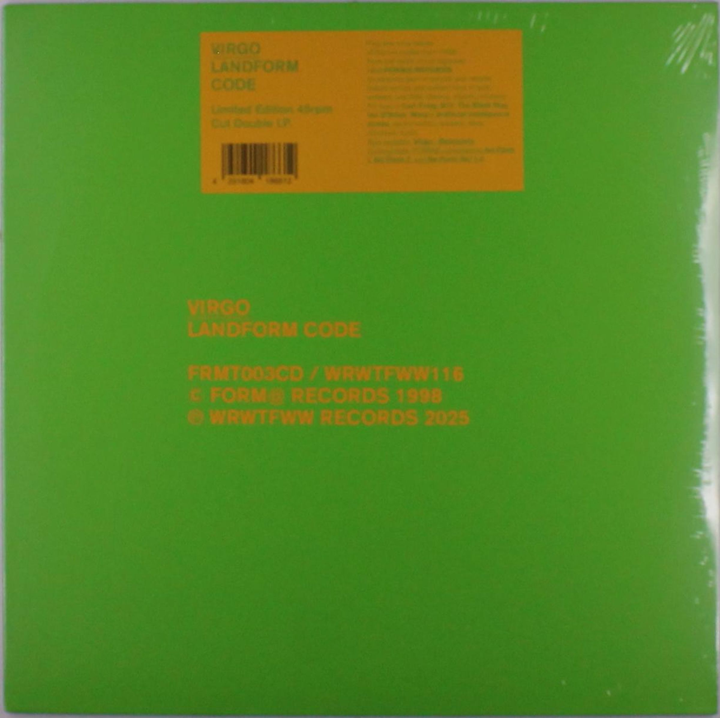 "VIRGO LANDFORM CODE" steht groß oben, in orange auf grünem Hintergrund. Es handelt sich um ein schlichtes Cover-Design., 2 LPs