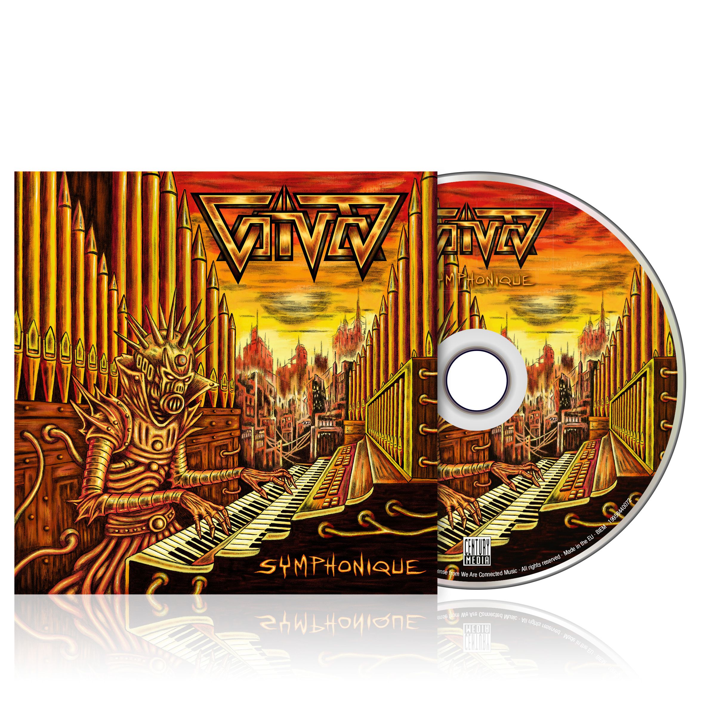 "Symphonique" in gotischer Schrift. Bandlogo oben. Illustration: Ein Roboter spielt Orgel vor feuriger Kulisse., CD