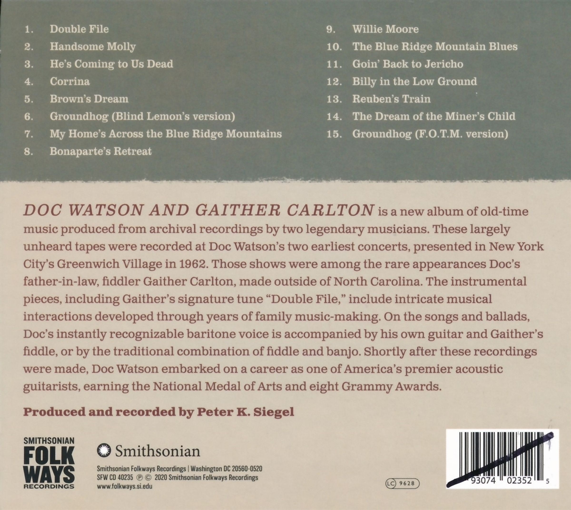 »Doc Watson und Gaither Carlton« ist ein neues Old-Time Music Album, das mit Archiv-Aufnahmen dieser beiden legendären Musiker produziert wurde. Die größtenteils unveröffentlichten Aufnahmen entstanden bei zweien von Doc Watsons ersten Konzerten, die in Greenwhich Village in New York präsentiert wurden. Diese Konzerte gehören zu den raren Auftritten von Doc's Schwiegervater, dem Fiddler Gaither Carlton, außerhalb North Carolinas.