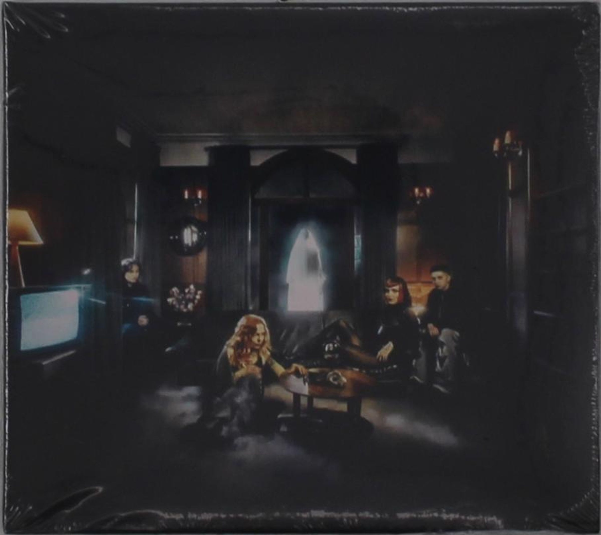 Ein dunkler Raum mit vier Personen auf einem Sofa, ein Fernseher links flackert, im Hintergrund eine helle Türöffnung., CD