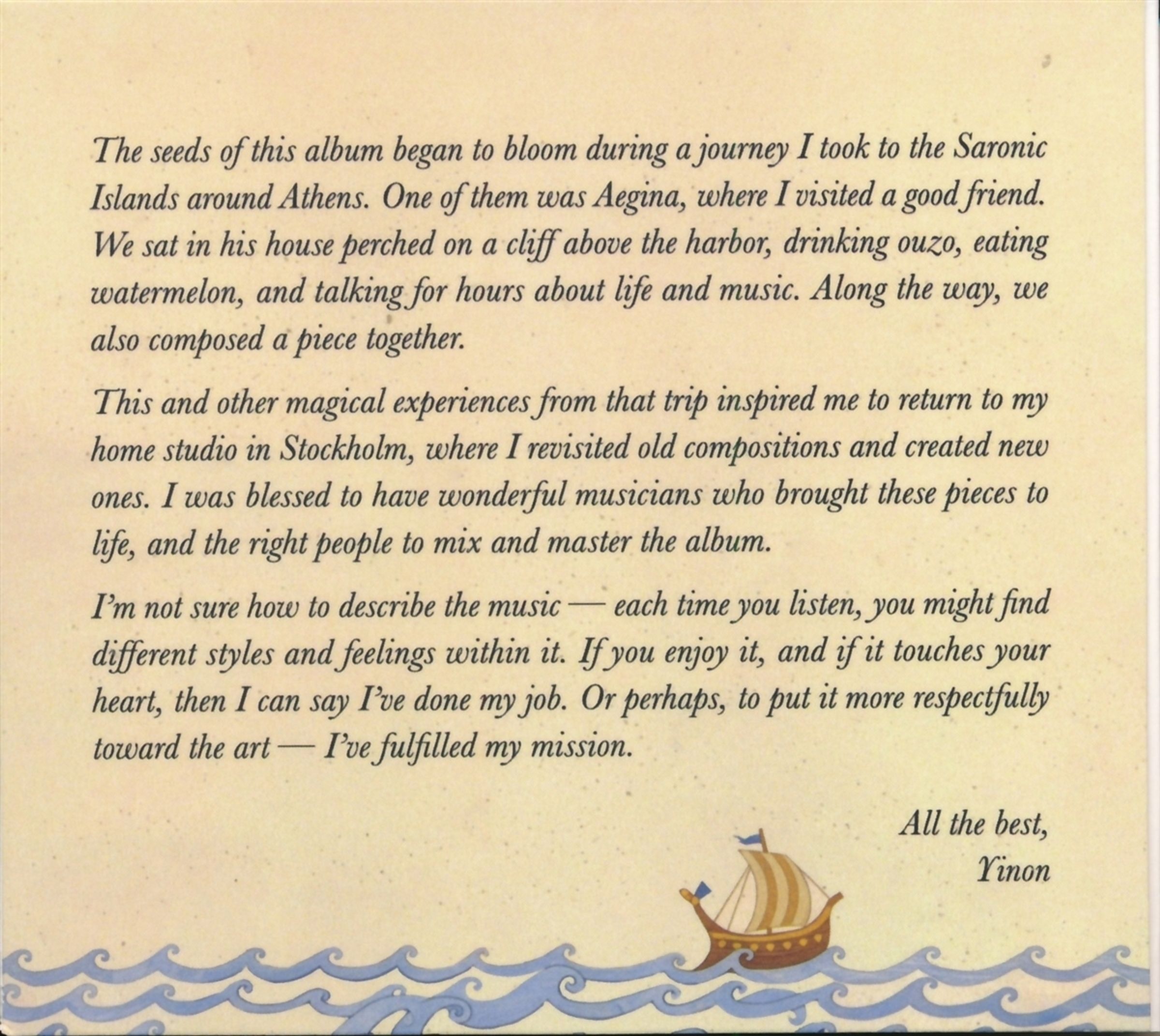Die Idee zu Aegina's Secret" entstand nach einem Besuch Yinons der Insel Ägina, einer der Saronischen Inseln in der Nähe Athens. Die Begegnungen, die er dort hatte, die vielfältigen Menschen, denen er begegnete, und die einzigartige Atmosphäre der Insel inspirierten ihn dazu, mit dem Komponieren und Aufnehmen zu beginnen. Zu den bereits aufgenommenen Demos nahm er Coverversionen, die wichtige Etappen seiner musikalischen Karriere markieren wie Misirilou aus dem Tarantino Film Pulp Fiction oder