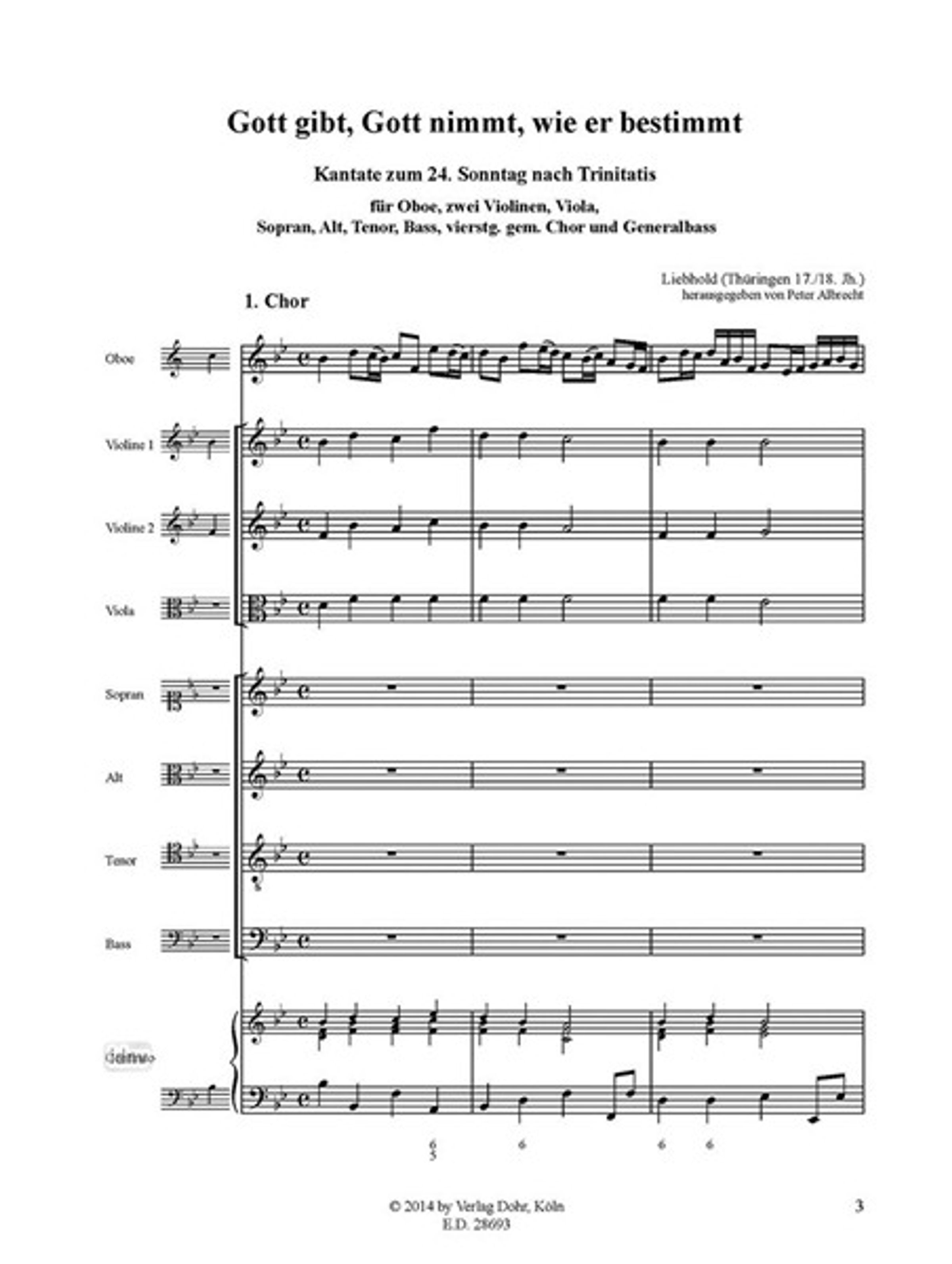 Gott gibt, Gott nimmt, wie er bestimmt für Oboe, zwei Violinen, Viola, Sopran, Alt, Tenor, Bass, 4stg. gem. Chor und Generalbass