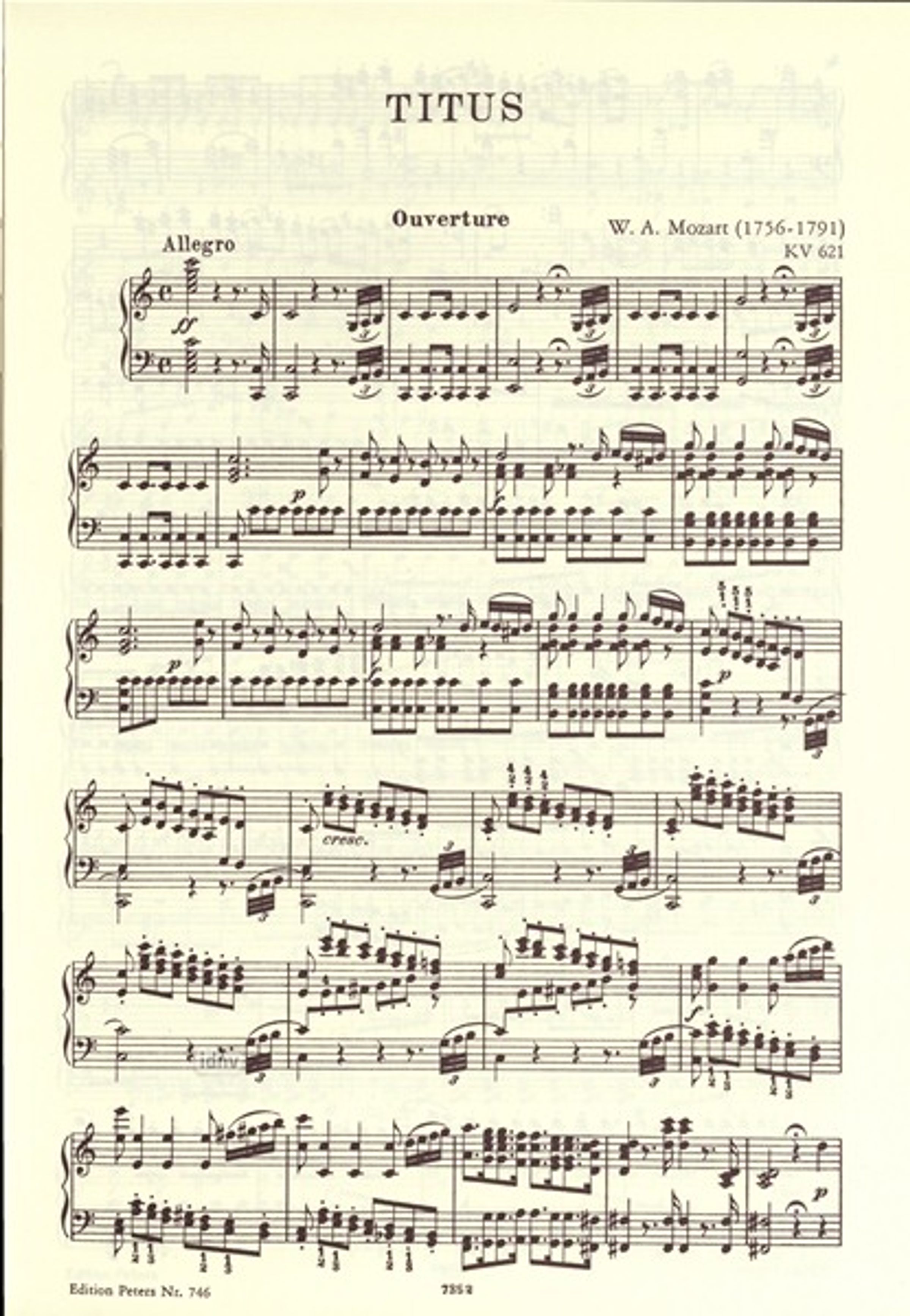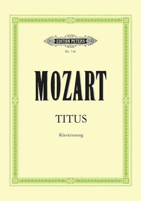 Mozart's La clemenza di Tito (The Clemency of Titus), K. 621, is an opera seria in two acts composed to an Italian libretto by Caterino Mazzola. This edition is the vocal score with piano reduction accompaniment by Gustav Kogel.