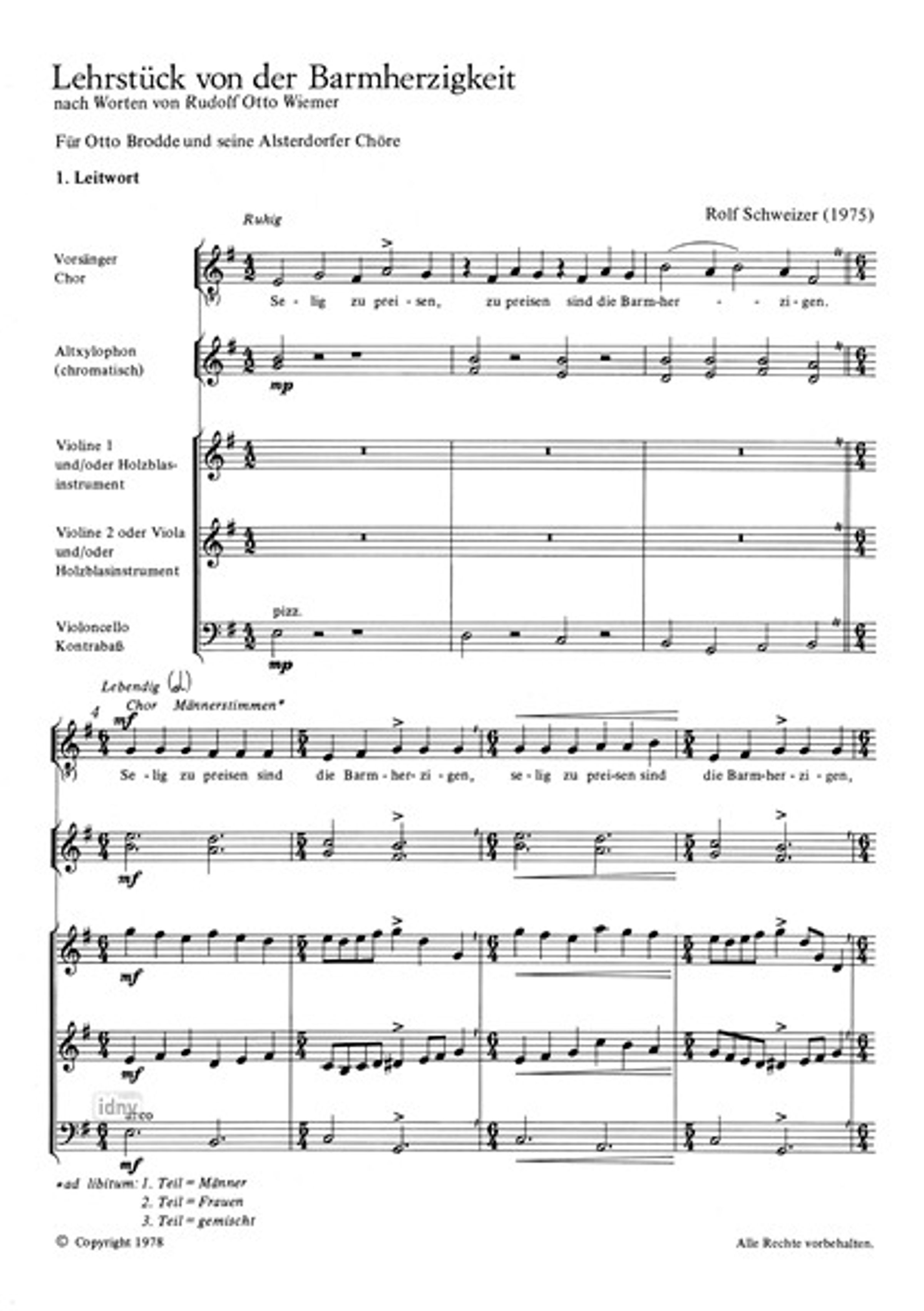 - Solo Männerstimme, Chor SSA (Chor SSM), Xil, Violinen (2), Cello, Kontrabass