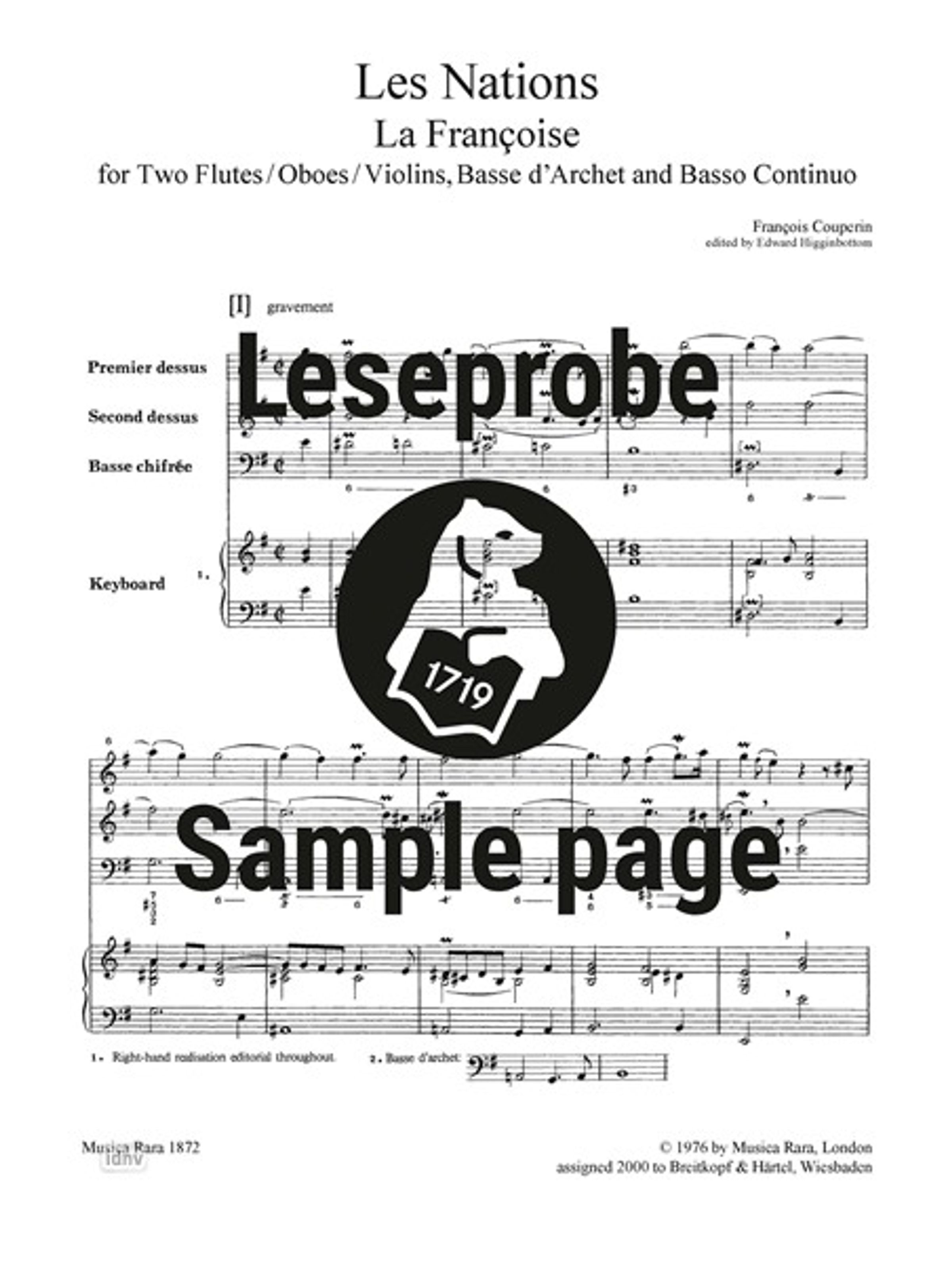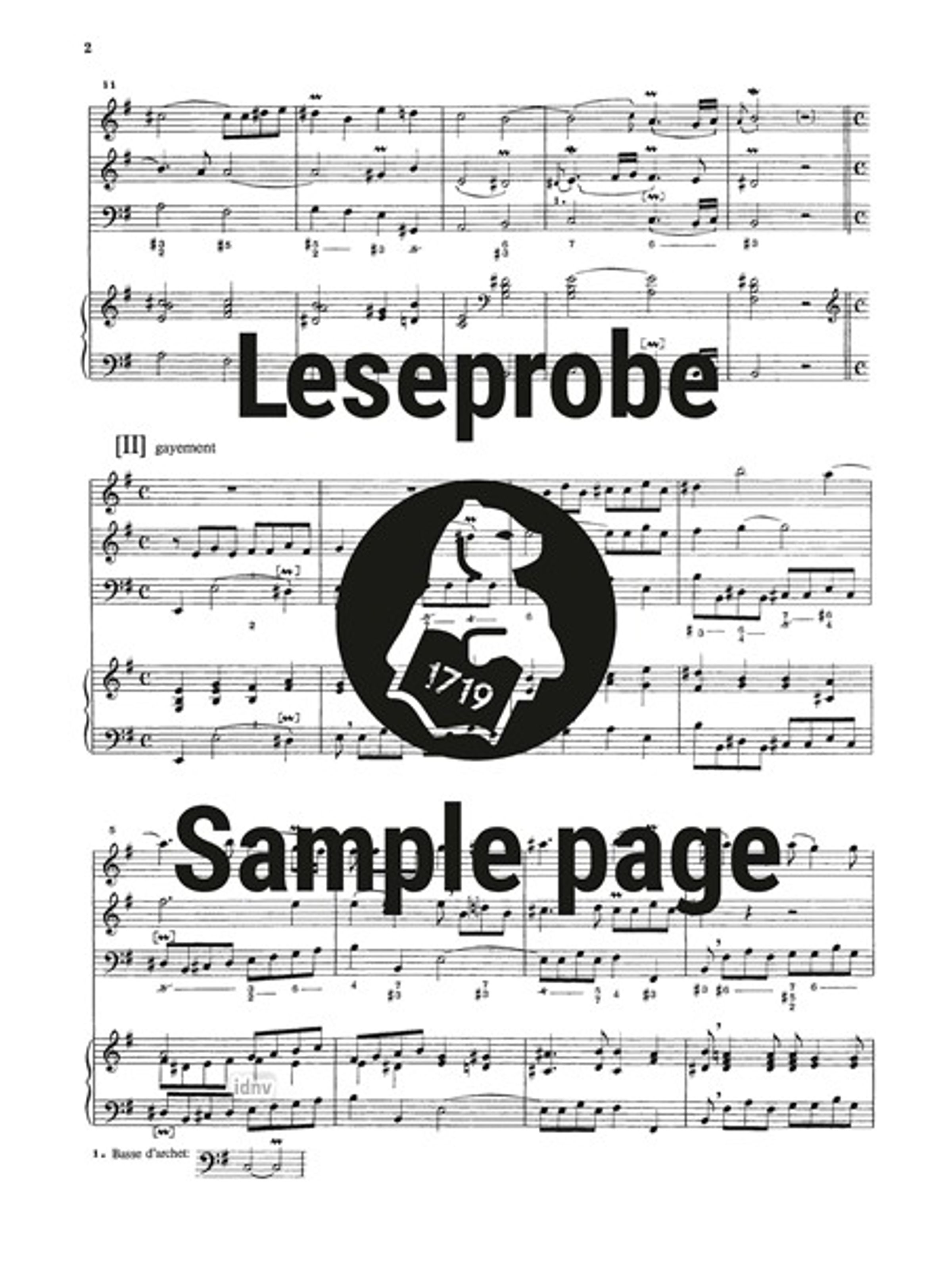 - Flöte (2) (Oboe (2), Violine (2)) , Cello (Gambe, Kontrabass) , Basso continuo