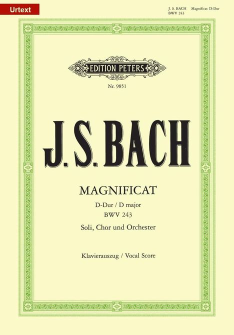 Für SSATB soli, Chor u. Orch., m. 4 Einlagesätzen a. d. Fassg. in Es-Dur, Urtext. Herausgegeben von Hans-Joachim Schulze und Johannes Muntschick. Enthält 4 hinzugefügte Weihnachtsvertonungen aus der ersten Fassung BWV 243a. Klavierauszug mit Klavierauszug der Orchesterbegleitung.