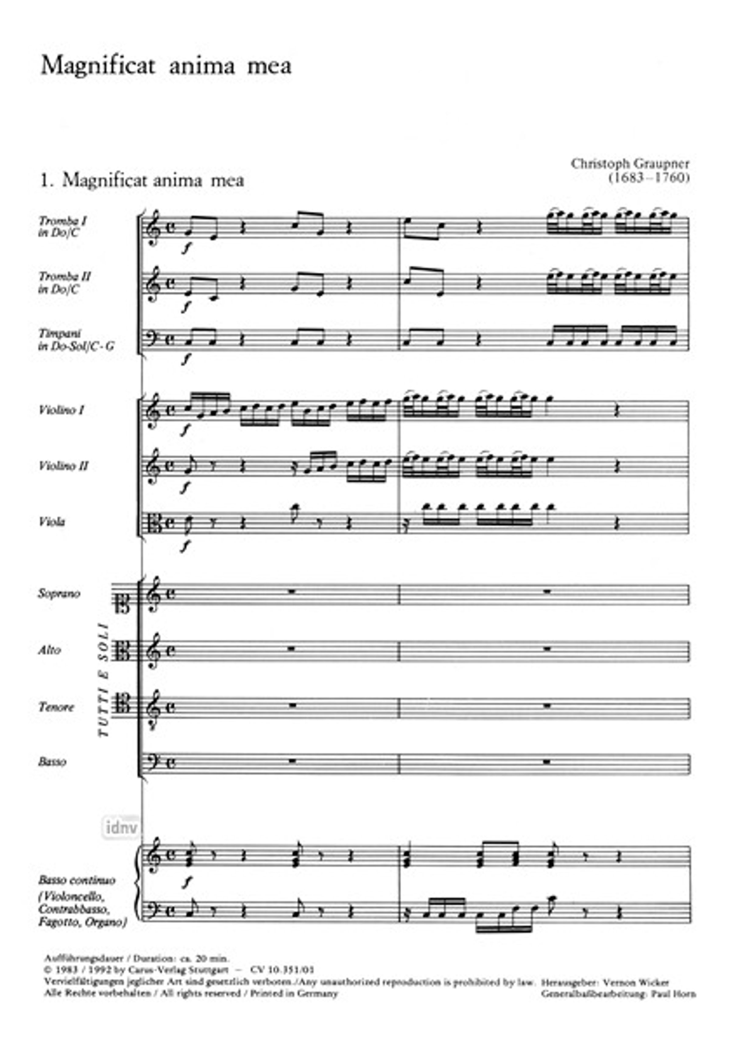 - Soli SATB, Gemischter Chor (SATB), Oboen (2), Trompeten (2), Pauke, Violinen (2), Viola, Basso continuo