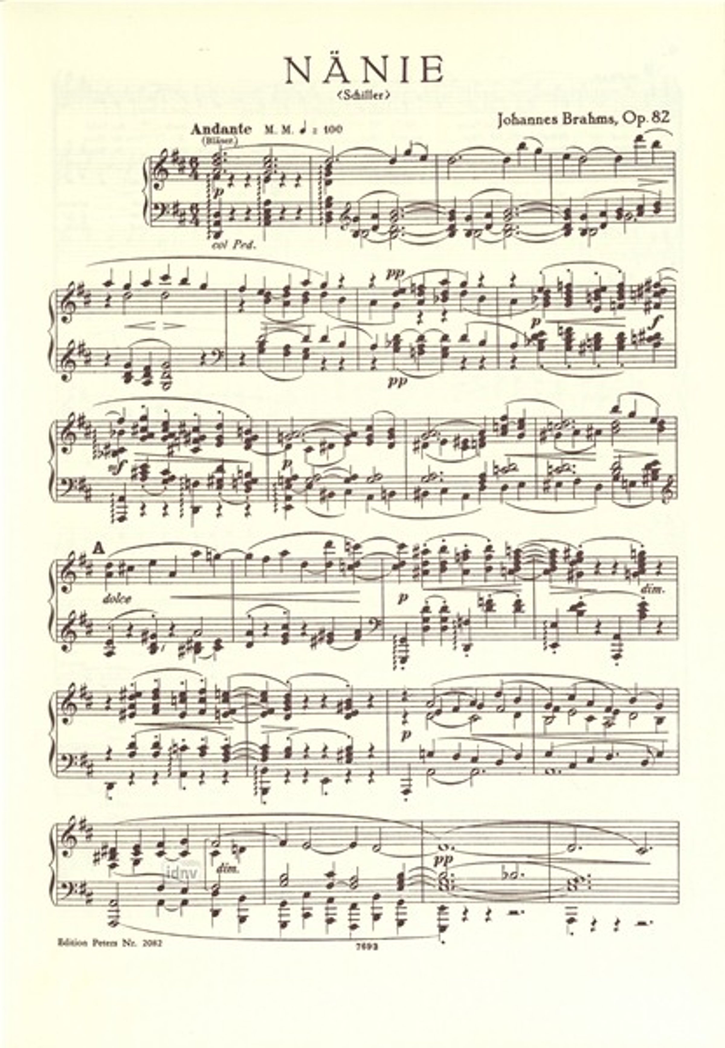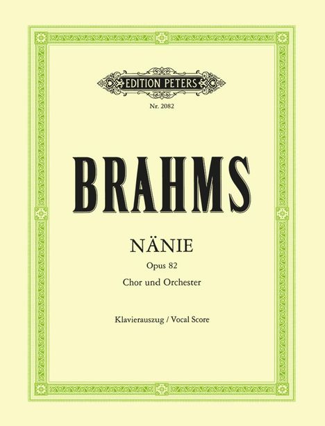 Brahms' Nänie op. 82 für Chor und Orchester. Der Text stammt von Friedrich Schiller. Das Wort "Nänie" leitet sich von dem alten lateinischen Wort "noenia" ab, einem Trauerspruch, der von den überlebenden Eltern des Verstorbenen gesungen wurde.