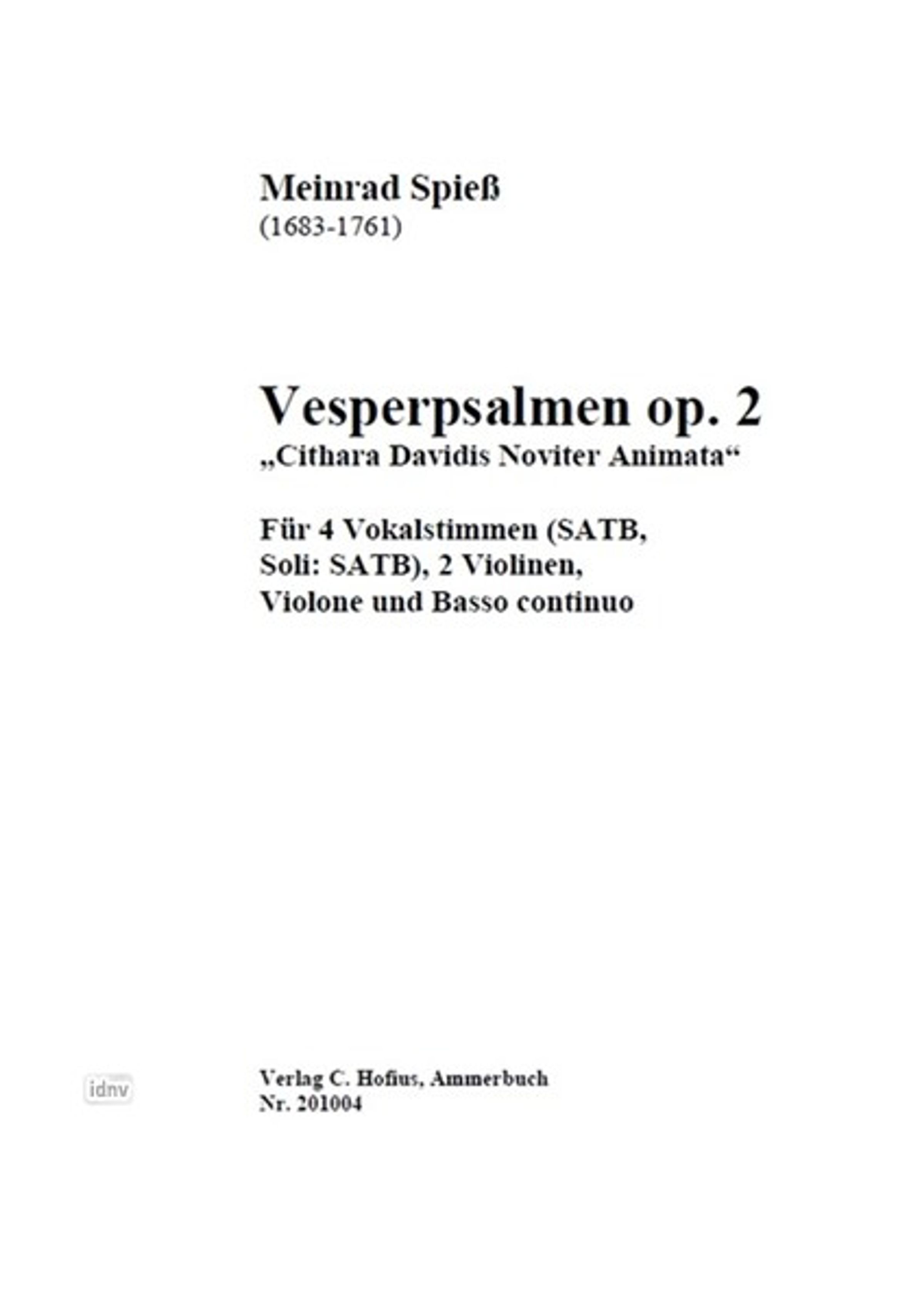 Meinrad Spiess: Vesperpsalmen "Cithara Davidis Noviter Animata" für 4 Vokalstimmen (SATB, Soli: SATB), 2...