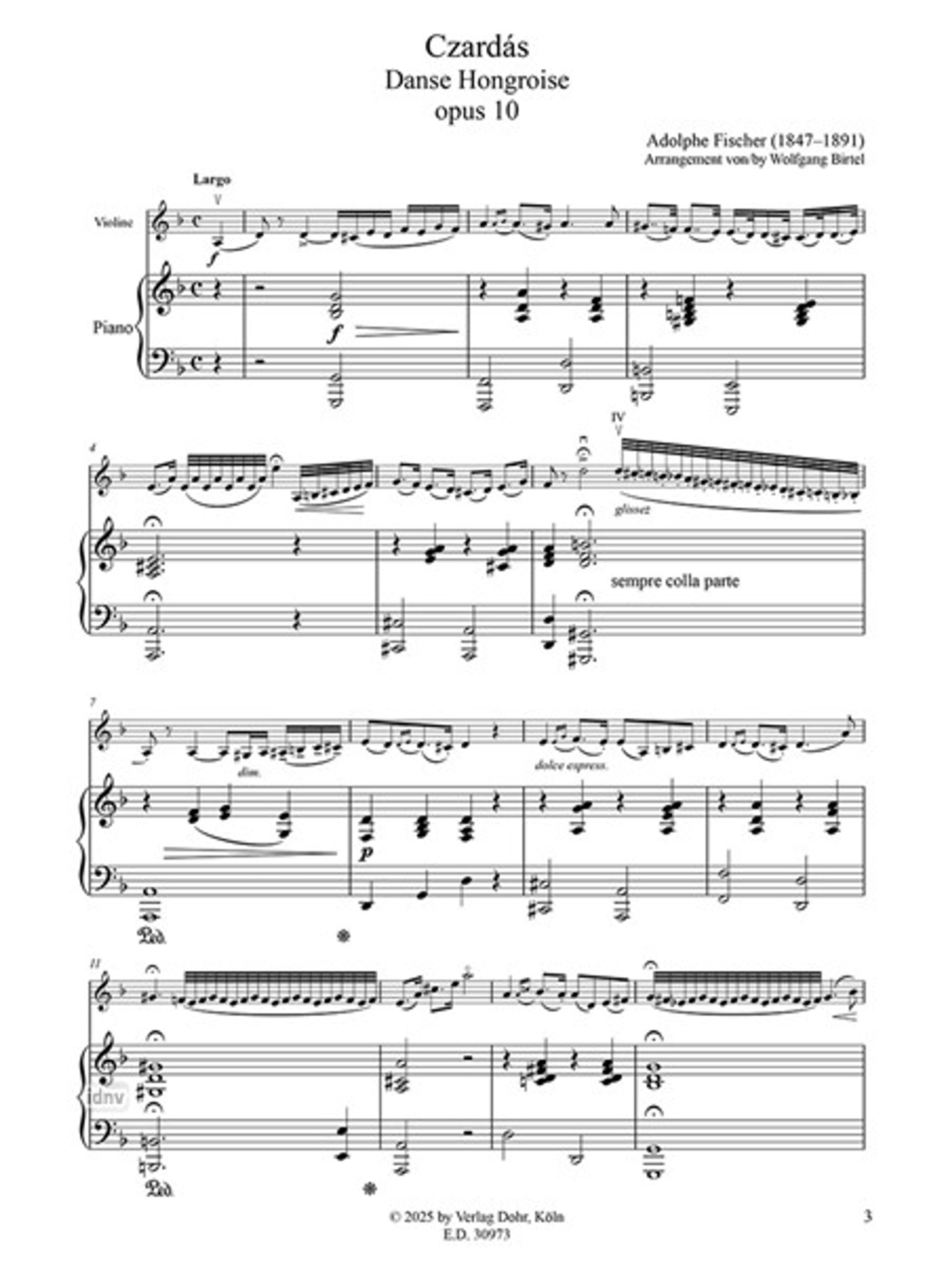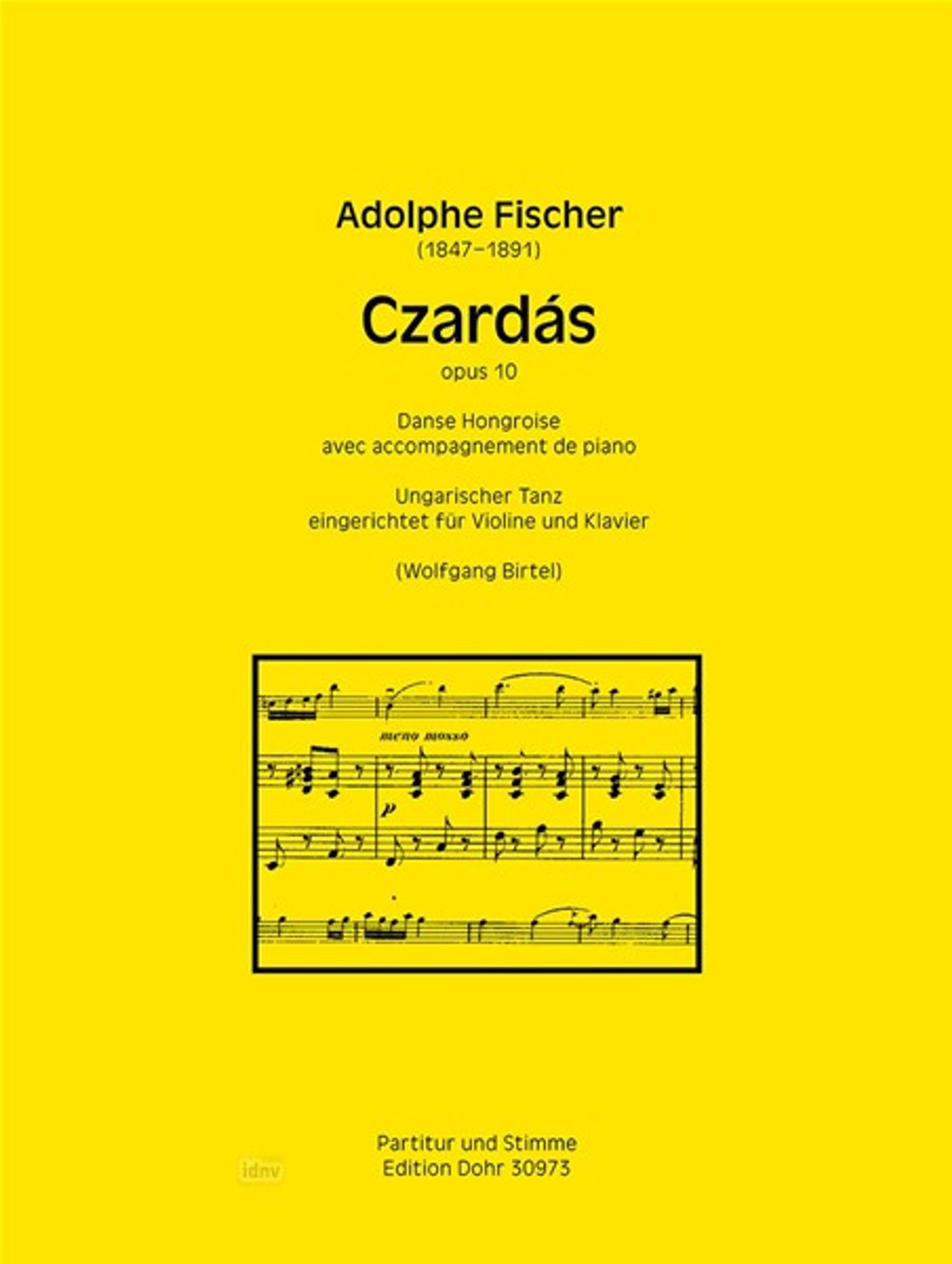 Adolphe Fischer, Czardás, opus 10, Ungarischer Tanz für Violine und Klavier. Notenblatt auf gelbem Hintergrund., Noten