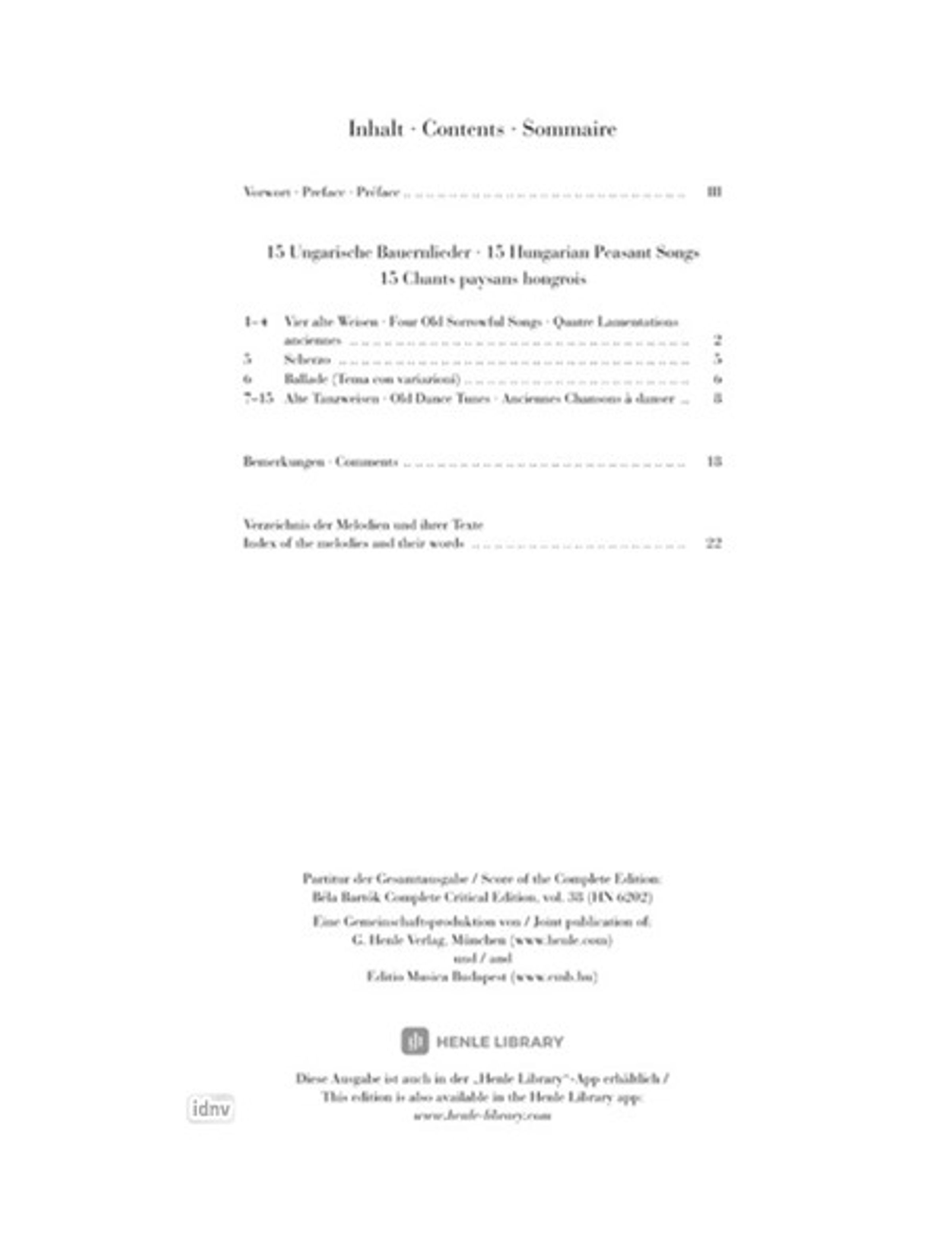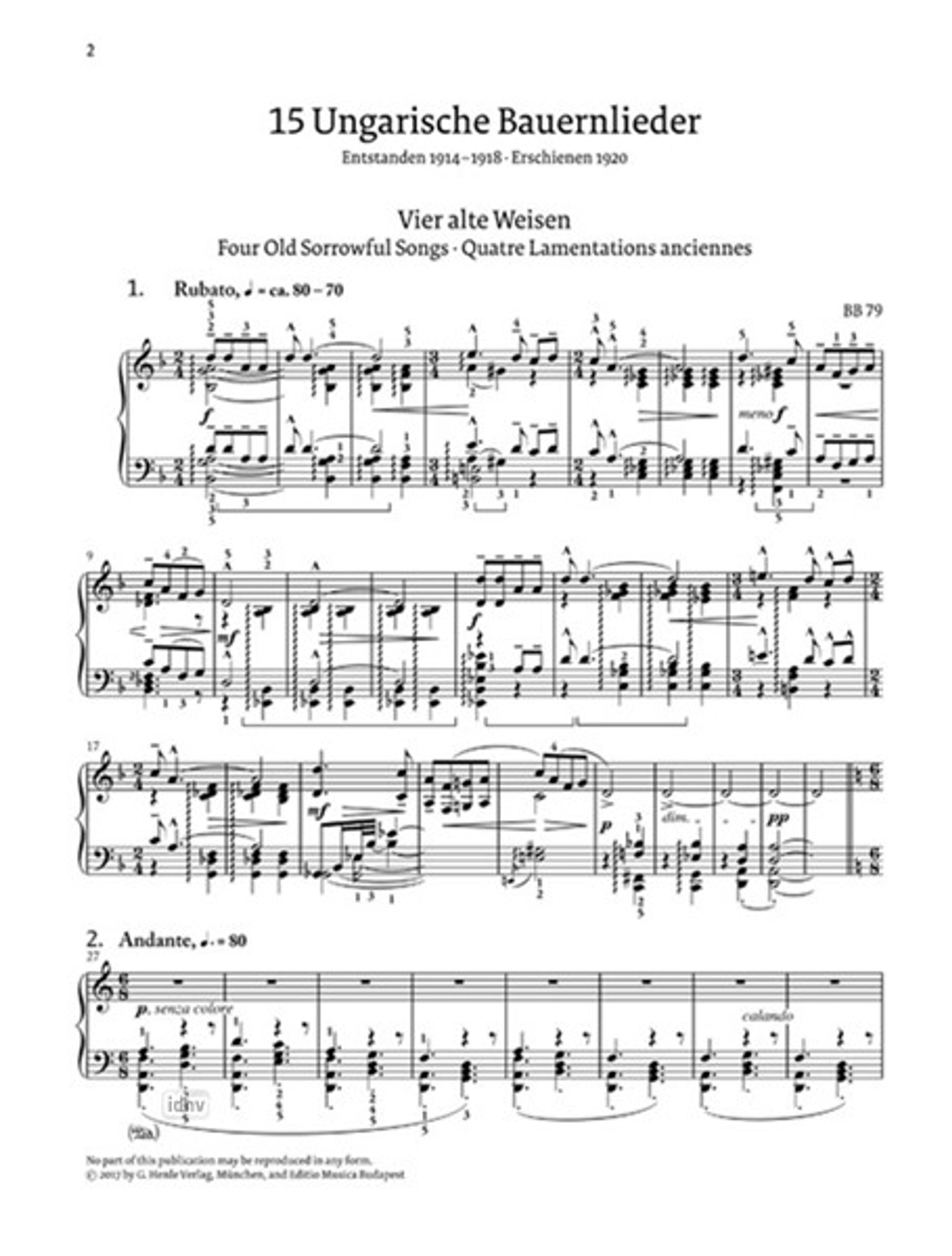 In einer Notiz zur 1914 geplanten Erstausgabe der Ungarischen Bauernlieder schreibt Bartók, dass "die hier veröffentlichten Melodien Volkslieder im engsten Sinne des Wortes, besser gesagt Bauernlieder" seien. Bartók zog die Veröffentlichung dieser Sammlung zunächst jedoch wieder zurück und ergänzte sie um neue, in der Zwischenzeit gesammelte Volksmusik. Erst 1920 erschien schließlich die Erstausgabe im Druck. Bartók-Forscher László Somfai rollt die komplizierte Entstehungsgeschichte dieses Werks in seinem Vorwort auf. Die Bemerkungen am Ende der Ausgabe enthalten wichtige Hinweise zur Aufführungspraxis, gewonnen aus den beiden Aufnahmen, die der Komponist 1927 und 1936 von einigen der Stücke einspielte. Der Notentext schließlich ist dem in Vorbereitung befindlichen Band der Bartók-Gesamtausgabe entnommen. Ein weiterer, sehr populärer Bartók-Titel im G. Henle Verlag!Anmerkungen: