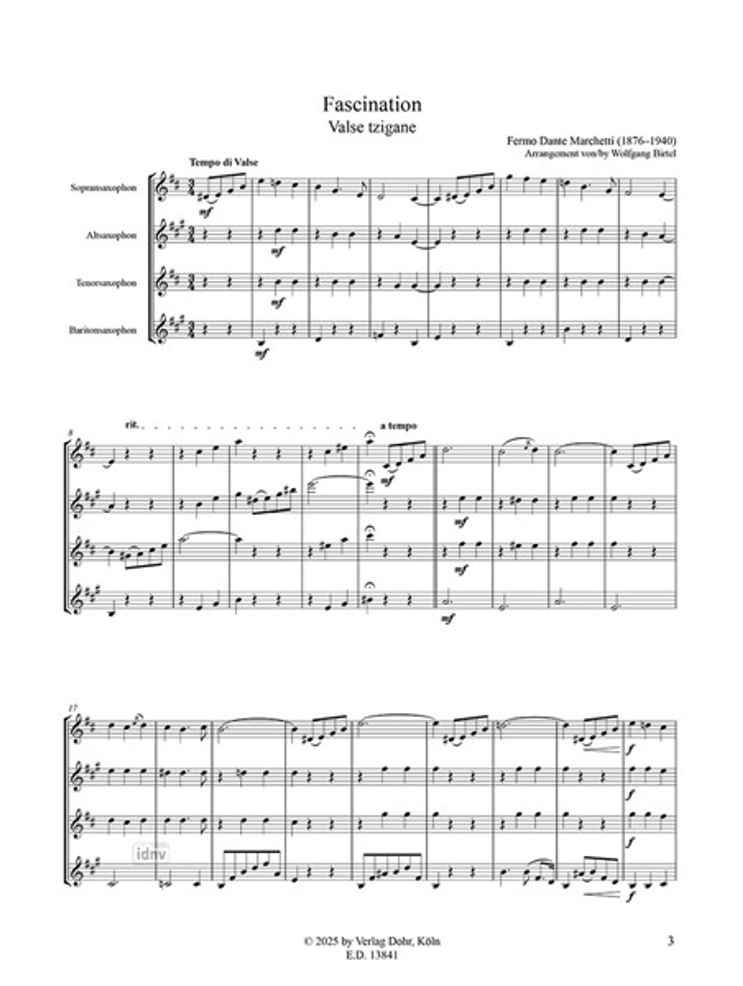 "SaxoPhonPower, Arrangements für Saxophon-Quartett, Vol. 21, Fermo Dante Marchetti, Partitur und Stimmen, Edition Dohr 13841.", Noten