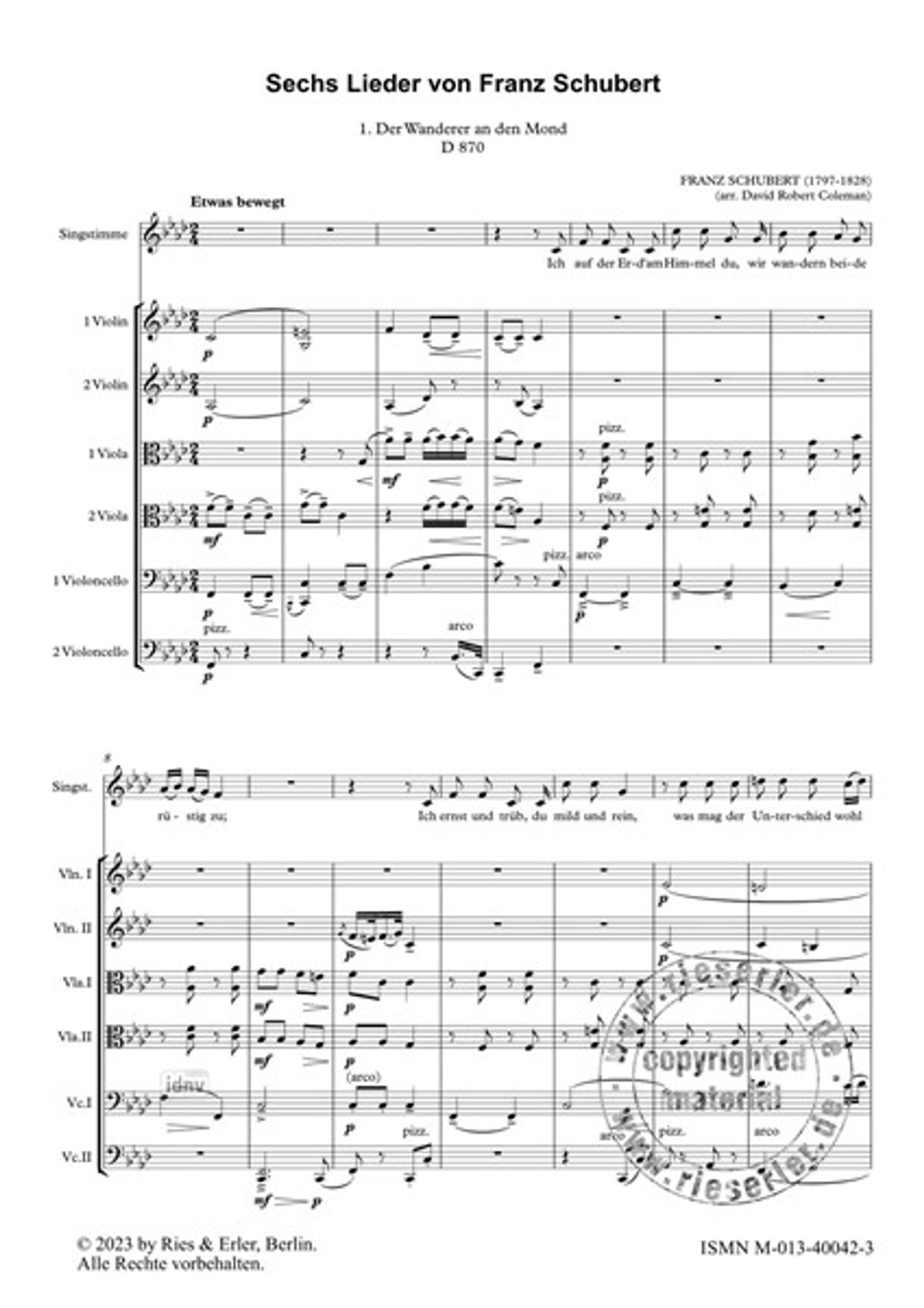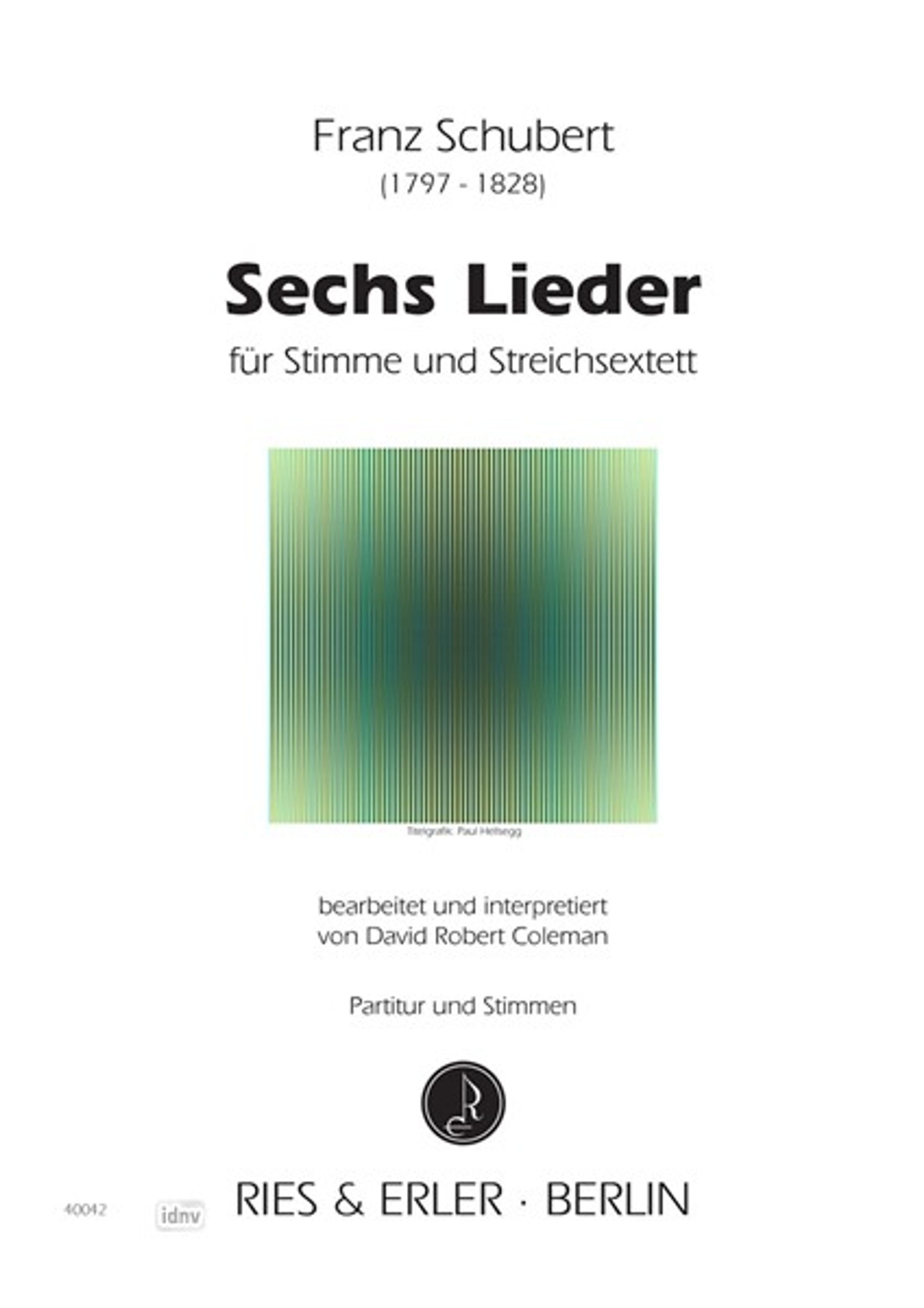 "Sechs Lieder für Stimme und Streichsextett" von Franz Schubert. Unten "Ries & Erler · Berlin". Grafik mit grünen Linien., Noten