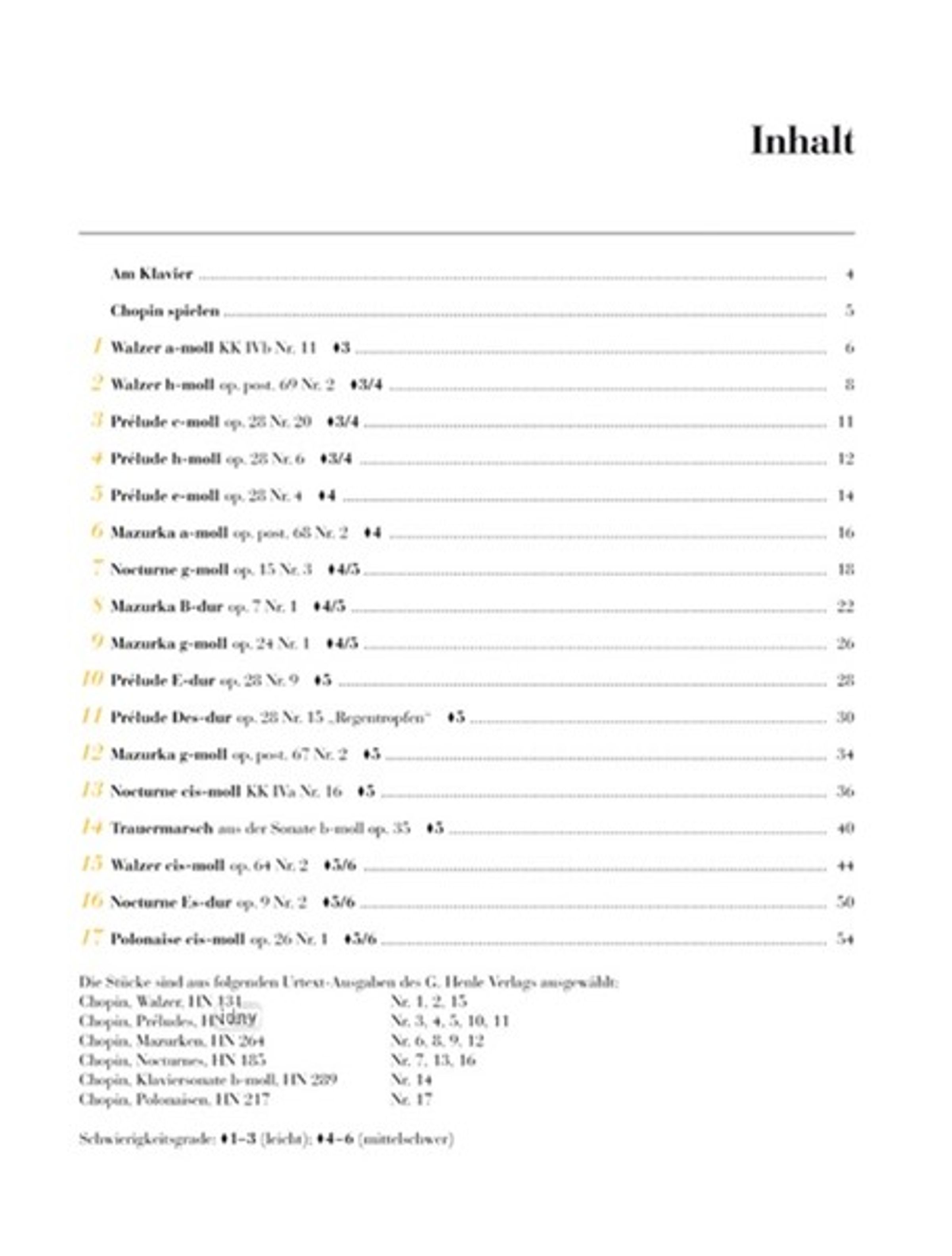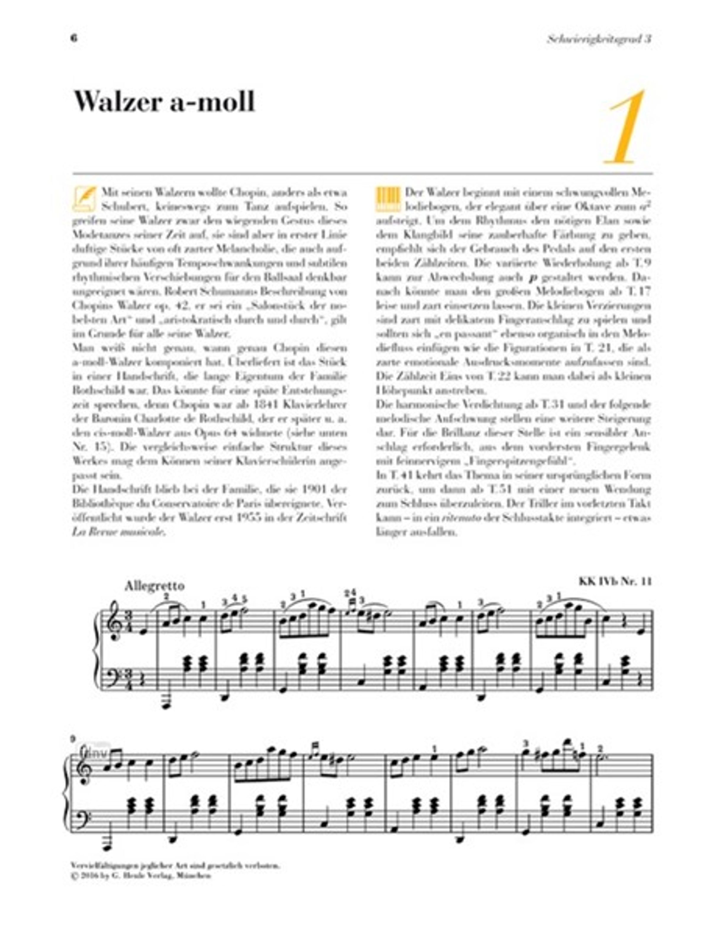 Obwohl Frédéric Chopin zu den größten Klaviervirtuosen seiner Zeit zählt, öffnet er die Tür zu seinem romantischen Zauberreich auch den technisch weniger beschlagenen Klavierspielern: er verstand es meisterhaft, seinen ganz eigenen, unverkennbaren Ton auch in nicht allzu schweren, kurzen Stücken wie etwa seinen Mazurken oder Walzern festzuhalten. Unser Auswahlband führt Stufe um Stufe in die Tonsprache des polnisch-französischen Meisters.