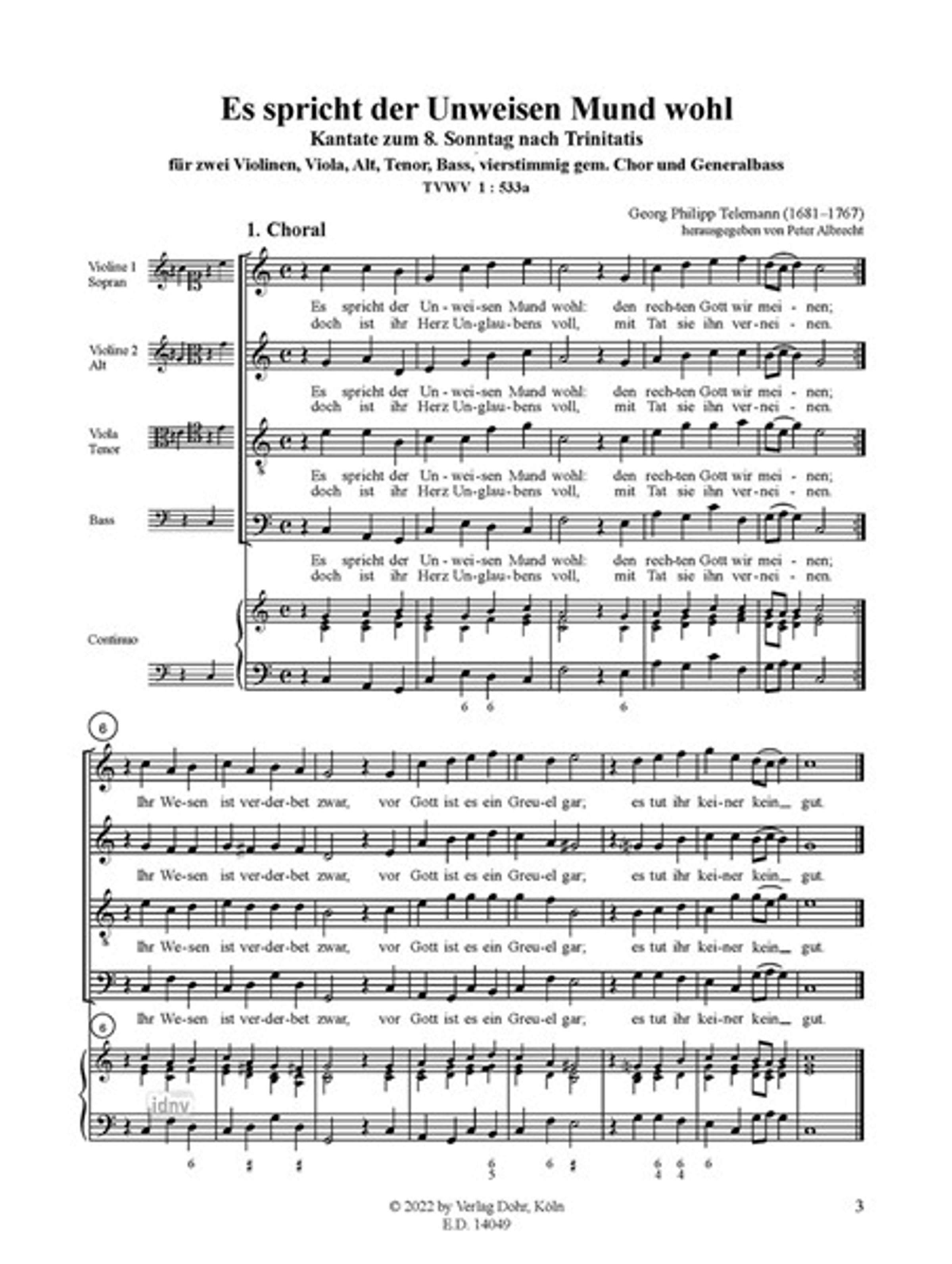 Es spricht der Unweisen Mund wohl für zwei Violinen, Viola, Alt, Tenor, Bass, 4stg. gem. Chor und Generalbass TVWV 1:533a