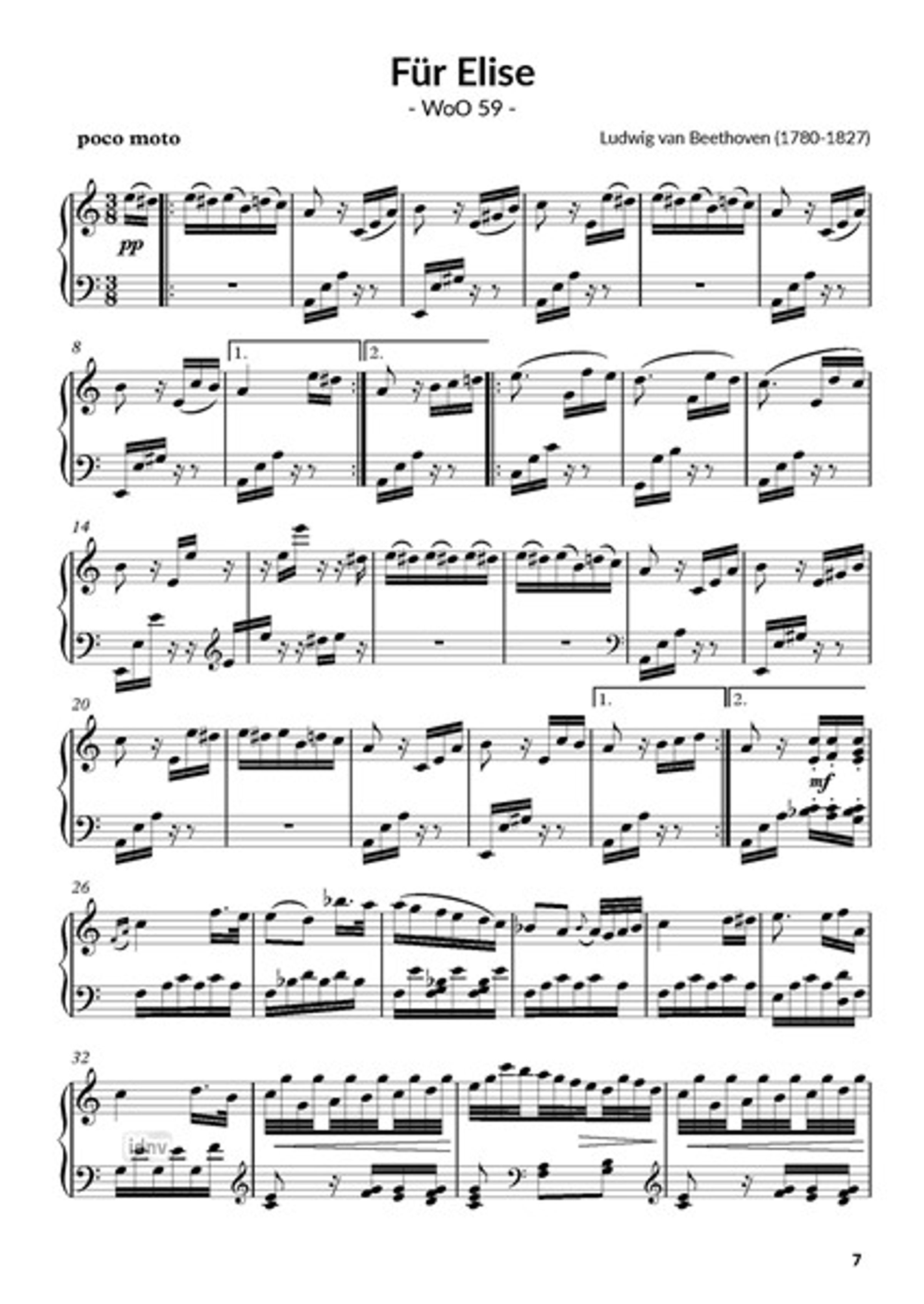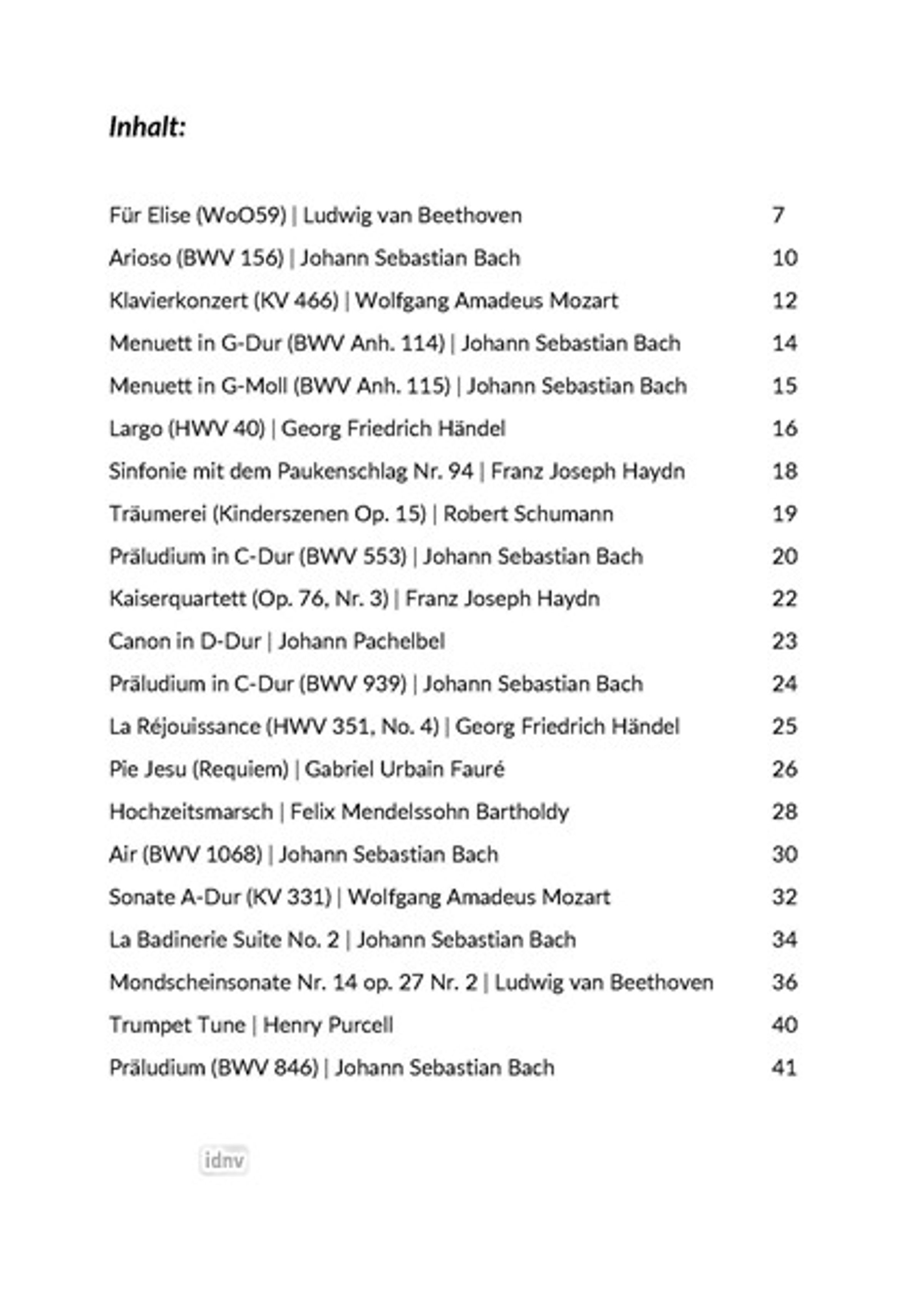 Die schönsten Klavierstücke, Melodien und Lieder aus Klassik und Barock in einem Notenheft. Von Bach über Beethoven und Mozart bis Schumann: In diesem Heft sind 22 Stücke enthalten, die für Klavier arrangiert sind. Aus dem Inhalt: Mondscheinsonate, Für Elise, Arioso, Klavierkonzert (KV 466), Bach-Menuette, Sinfonie mit dem Paukenschlag, Air, Bach-Präludien, Kaiserquartett, La Rejouissance, Pie Jesu, Träumerei, Largo (Xerxes), Hochzeitsmarsch u. a.