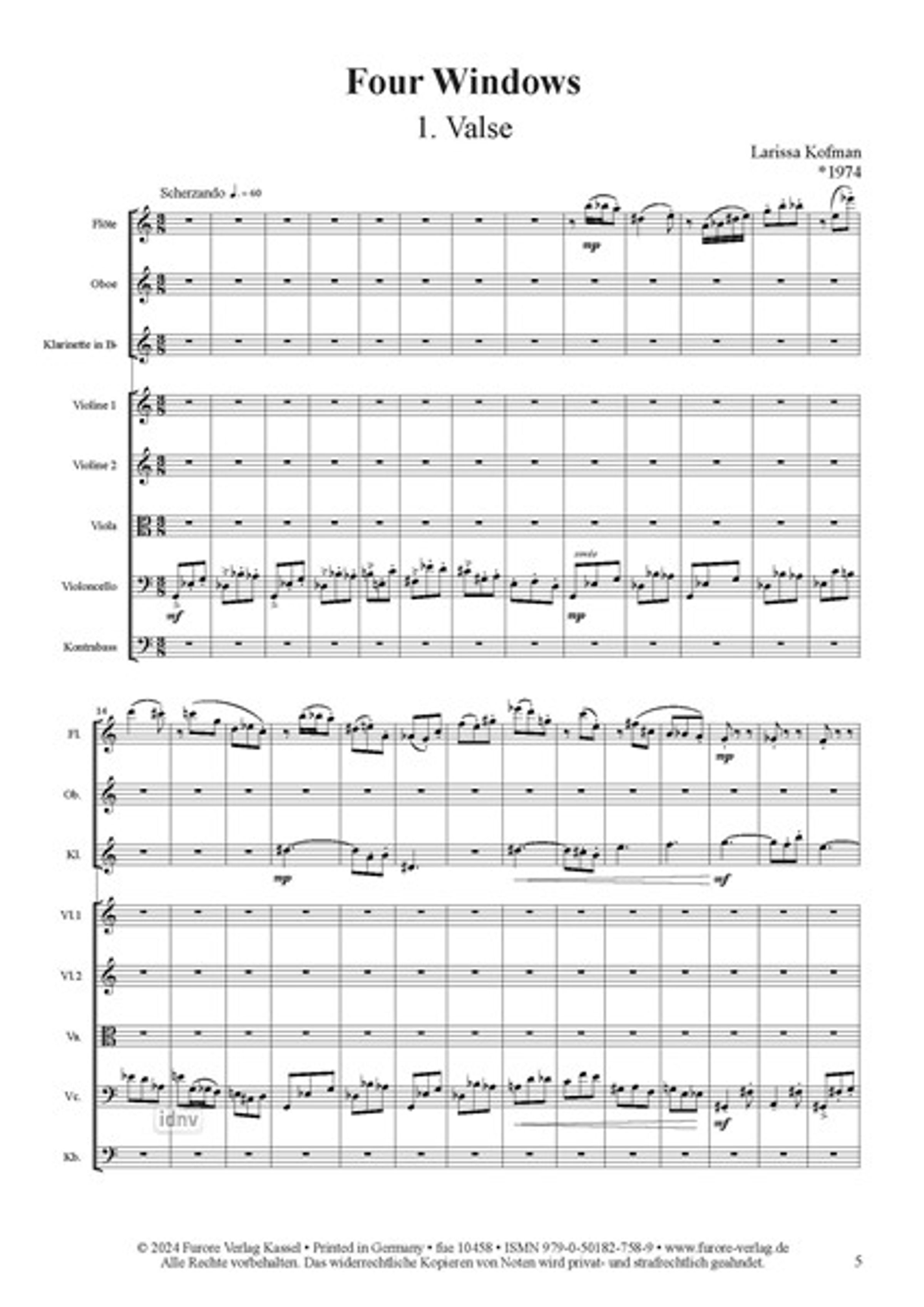 Larissa Kofman: Four Windows für Flöte, Oboe, Klarinette, zwei Violinen, Viola, Violoncello und Kontrabass (2017)