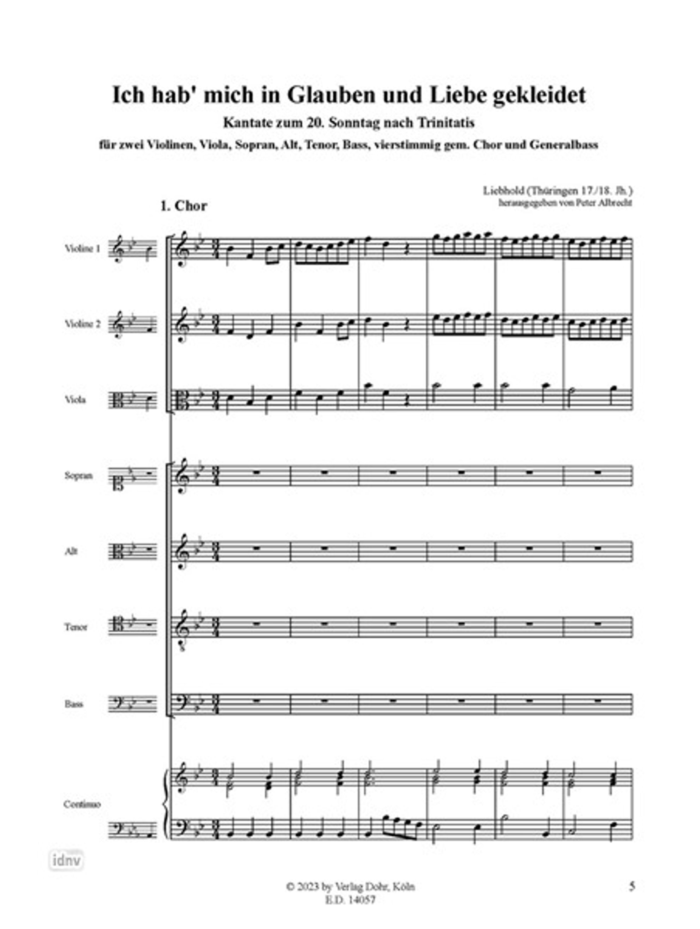 Liebhold: Ich hab' mich in Glauben und Liebe gekleidet für zwei Violinen, Viola, Sopran, Alt, Tenor, Bass, 4stg....